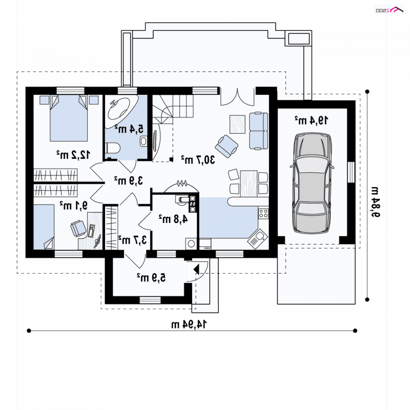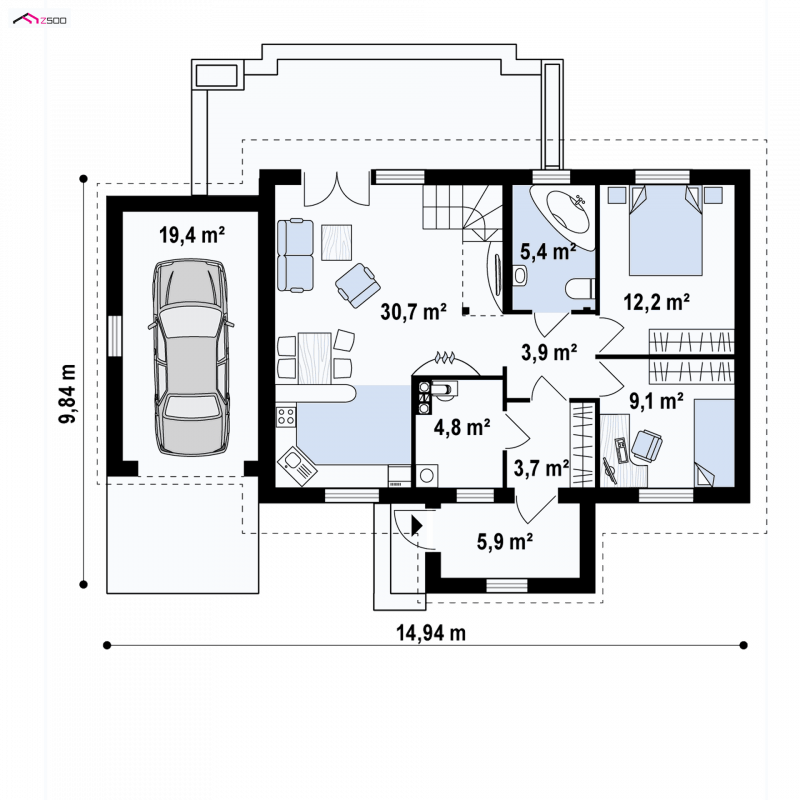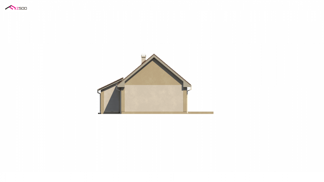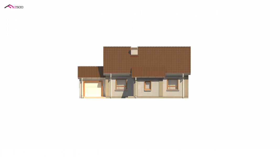 Projekt domu Z12 z garażem po lewej stronie (19,3m2) i zabudowanym gankiem wejściowym. Istnieje możliwość zagospodarowania przestrzeni poddasza.