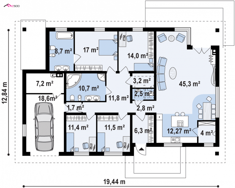 Z153 GL to funkcjonalny i praktyczny projekt domu z rozwiązaniem pomieszczeń na jednym poziomie.
