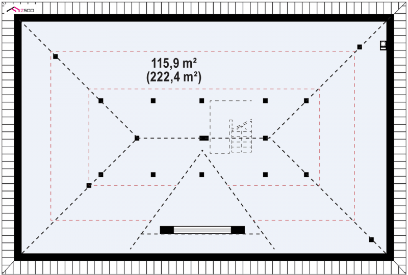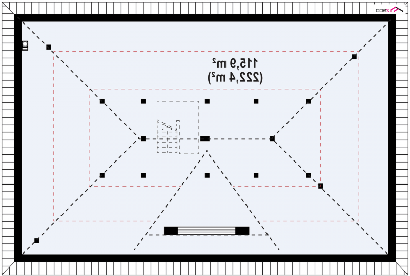 Budynek podzielony jest na dwie strefy: reprezentacyjną i prywatną. Pierwsza z nich składa się z jednej przestrzeni, którą tworzy przestronny salon, jadalnia i kuchnia. Przy kuchni zaprojektowano spiżarnię. Druga strefa znajduje się w lewej części domu. Zlokalizowano tu cztery duże sypialnie oraz dwie łazienki, mniejsza umieszczona została przy głównej sypialni oraz większa- wspólna z miejscem na wannę i prysznic. W środkowej części domu usytuowano hol, który łączy te dwie strefy; wc oraz sień z miejscem na szafę.