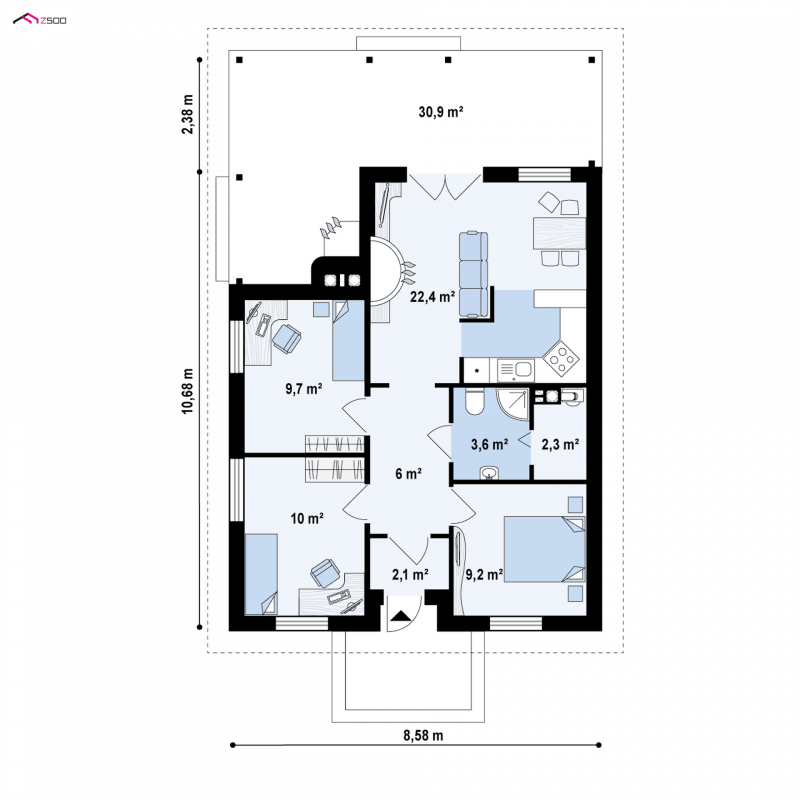 Dom Z16 może być zbudowany szybko i niewielkim kosztem dom parterowy z trzema sypialniami oraz obszerną werandą. Uniwersalne rozwiązania sprawią, że sprawdzi się zarówno jako całoroczny jak i letniskowy.