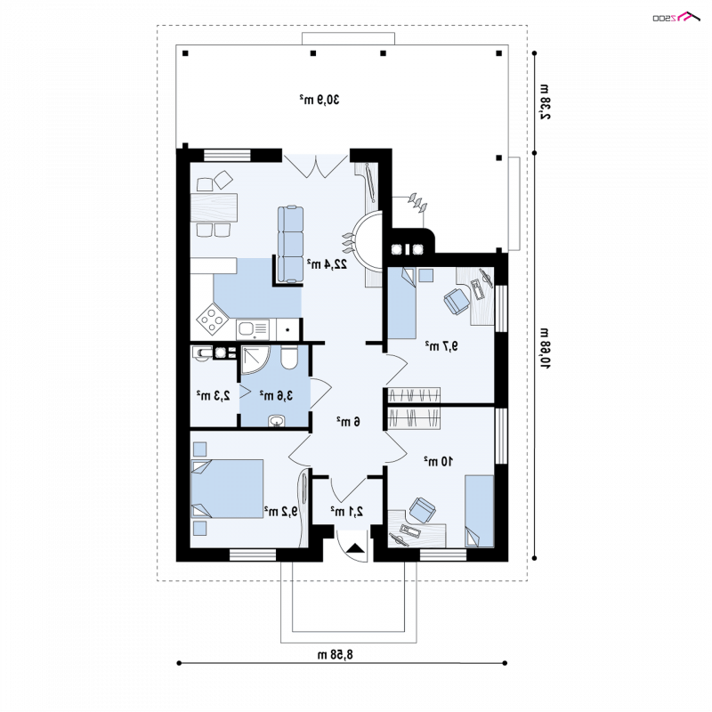 Układ funkcjonalny domu zaprojektowano na rzucie prostokąta z podcięciem od strony ogrodu. Znajdują się tu trzy pokoje, salon połączony z kuchnią i jadalnią oraz łazienka z wydzieloną strefą gospodarczą. Cecha indywidualna Z16 to komfortowa zadaszona weranda od strony ogrodu z kominkiem zewnętrznym. Sprawdzi się idealnie jako miejsce do wypoczynku, nawet w deszczowe dni. Dzięki prostej strukturze i braku wewnętrznych ścian konstrukcyjnych wnętrze domu można niemal dowolnie kreować przesuwając lub likwidując ścianki działowe. Istnieje możliwość zlikwidowania bocznych okien, co pozwoli usytuować budynek bliżej granicy działki.