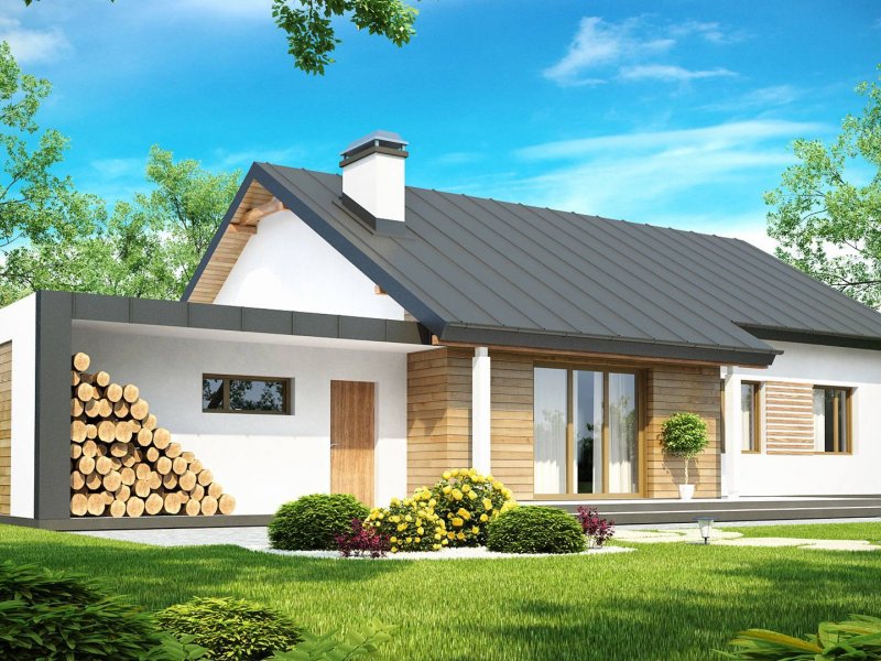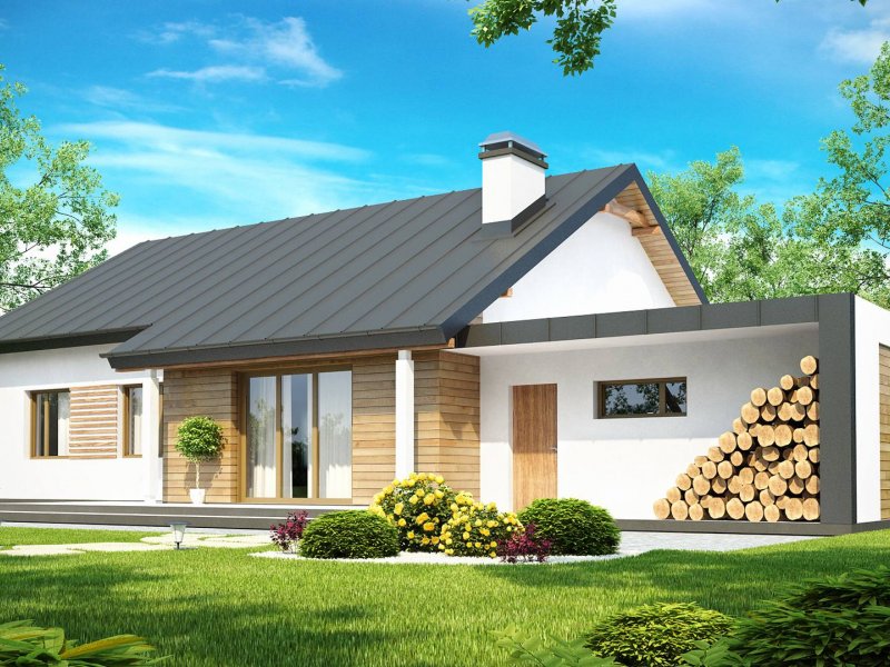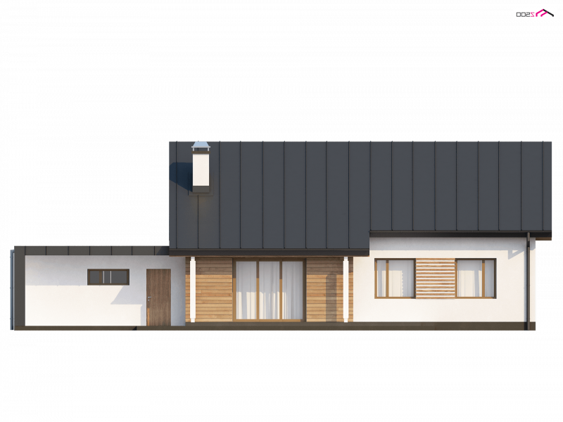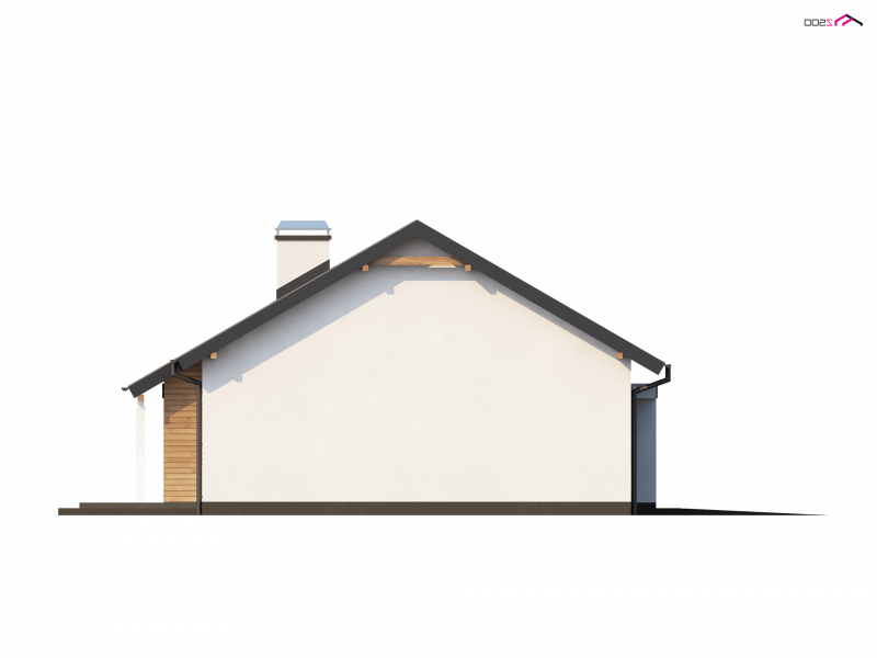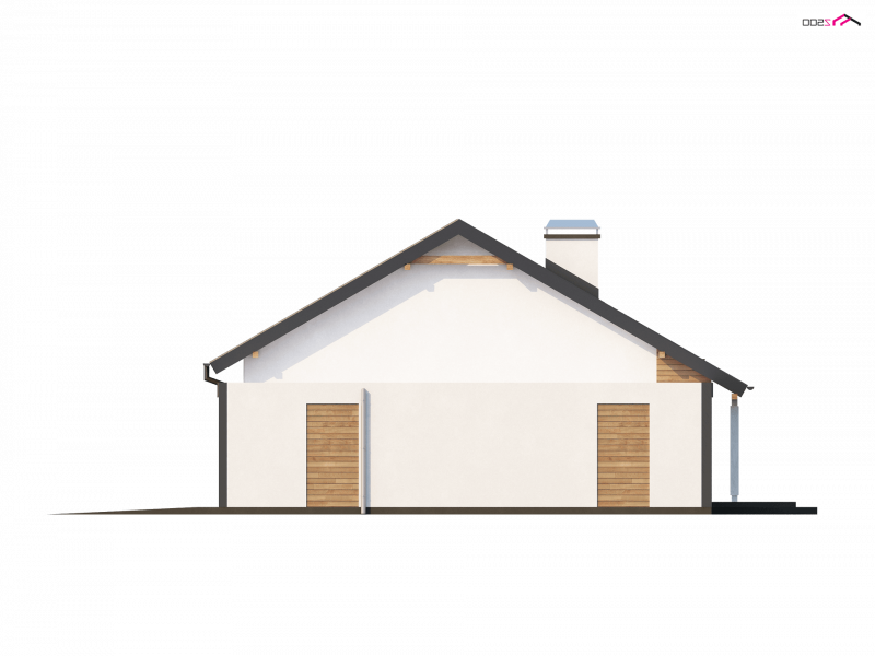 Prosta, zwarta bryła z dachem dwuspadowym i jeden komin czynią ten dom energooszczędnym i ekonomicznym w budowie. Duży podcień wejściowy, drewniane okładziny nadają bryle nowoczesny wygląd. W projekcie przewidziano funkcjonalne pomieszczenie gospodarcze z wyjściem do ogrodu oraz zadaszone miejsce na przechowywanie drewna do kominka.