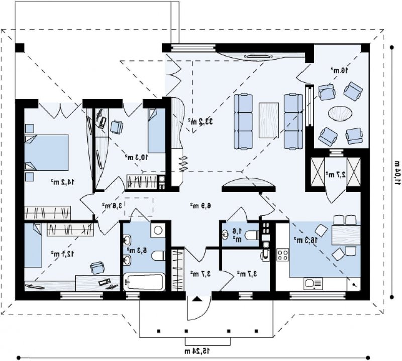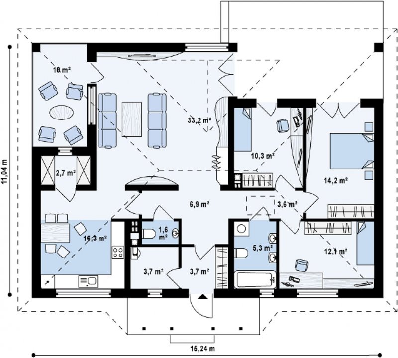 Z185 to prosta i komfortowa propozycja domu parterowego. Bryła domu przekryta jest kopertowym dachem i ubrana w oryginalne dodatki, świetnie podkreśla jego wyjątkowy charakter. Dom zbudowany jest na planie prostokąta dzięki czemu jest tani w budowie oraz ekonomiczny w użytkowaniu.