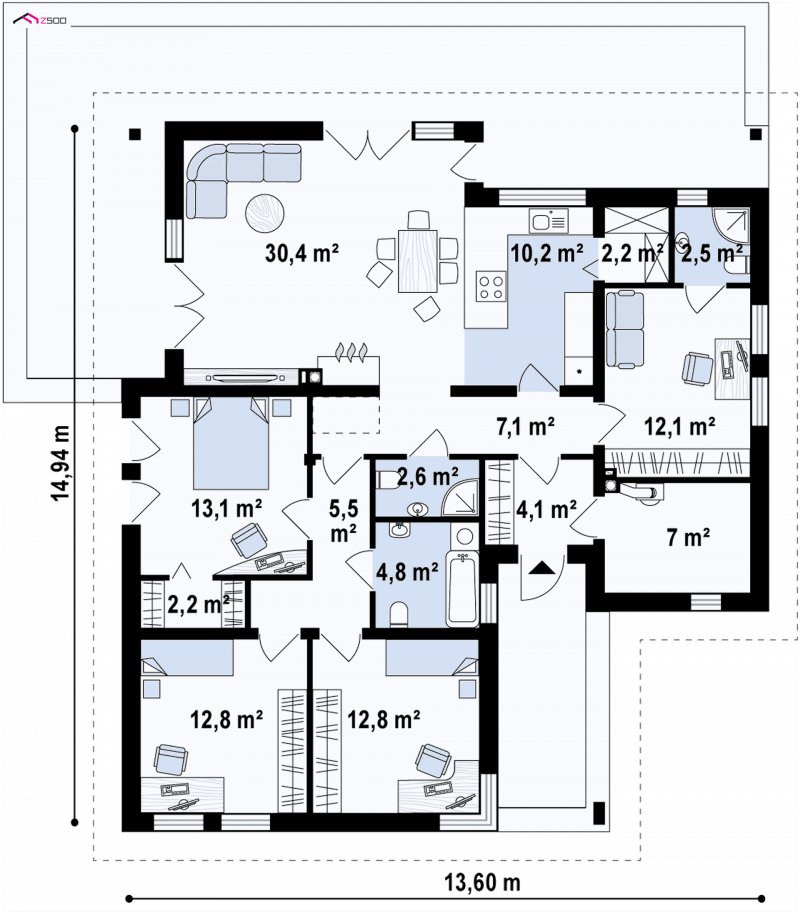 Z204bG to wariant projektu z204 bez garażu. Czwarty - dodatkowy pokój z własną łazienką idealnie sprawdzi się jako gabinet, pokój gościnny lub sypialnia.
