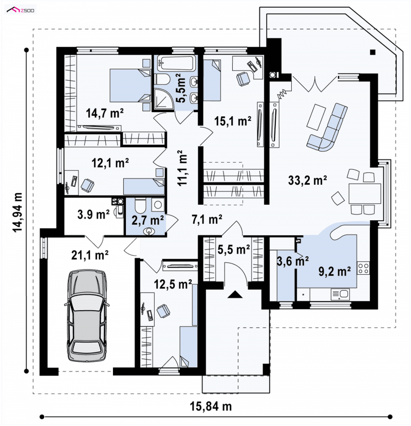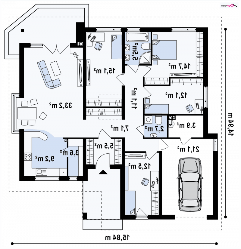 Komfortowy projekt dla rodziny ceniącej wygodę, duże pokoje przy stosunkowo małej powierzchni komunikacji.