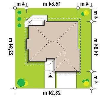 Projekt domu parterowego z możliwością wydzielenia części usługowej. Przewidziano cztery pokoje plus gabinet zlokalizowany przy wejściu do domu, z możliwością zrobienia niezależnego wejścia z zewnątrz. Przestrzeń domu podzielona na dwie strefy dzienną w której mamy duży pokój dzienny plus przestronna kuchnia ze spiżarnią zlokalizowaną przy chłodniejszej sieni. W wygodnym holu mamy miejsce na dużą szafę. Strefy reprezentacyjna oraz nocna są wyraźnie wydzielone, co zapewnia domownikom wygodę i komfort użytkowania. Przestronny salon jest dobrze doświetlony dzięki dużym przeszkleniom, a dla zwolenników celebracji posiłków jadalnia została zlokalizowana przy naświetlonym wykuszu, który otwiera dom na ogród.