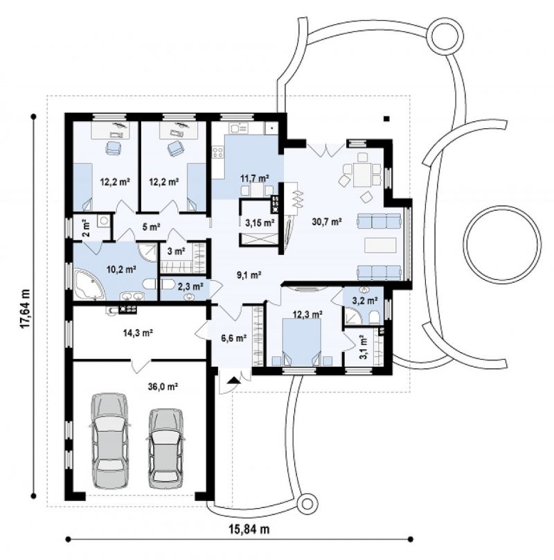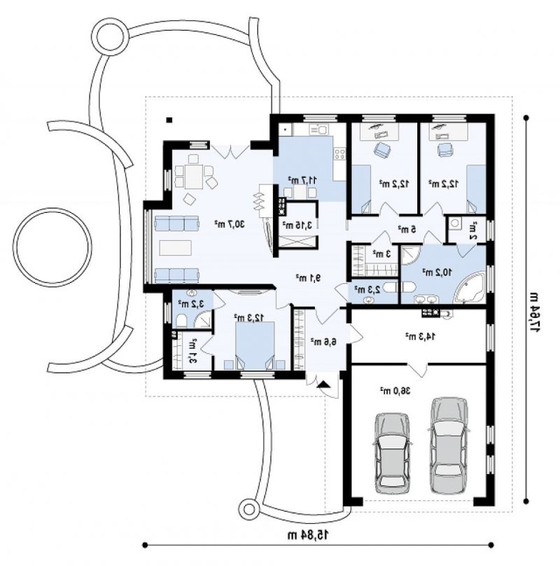 Część dzienna to przestronny salon i jadalnia z wykuszem. Dzięki małemu WC, dostępnemu z głównego holu, goście nie muszą wchodzić do pozostałych stref domu. Znajduje się również przestronna kuchnia, z funkcjonalną spiżarką. Dodatkową zaletą domu jest duże pomieszczenie gospodarcze i dwustanowiskowy garaż. Cześć nocna to dwa wygodne pokoje, duża łazienka z pralnią oraz garderoba. Z głównego holu dostępna jest również przestronna sypialnia rodziców z prywatną łazienką i garderobą. Z207 to dom dla osób poszukujących wyjątkowego projektu. Dzięki urozmaiconej bryle, dom ma ciekawą i miłą dla oka formę , która idealnie wtopi się w każdy krajobraz.