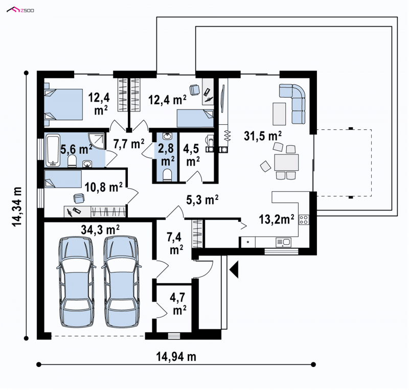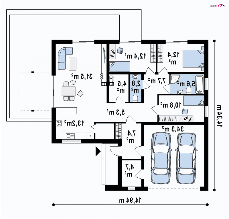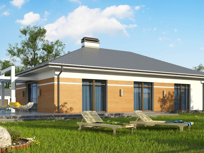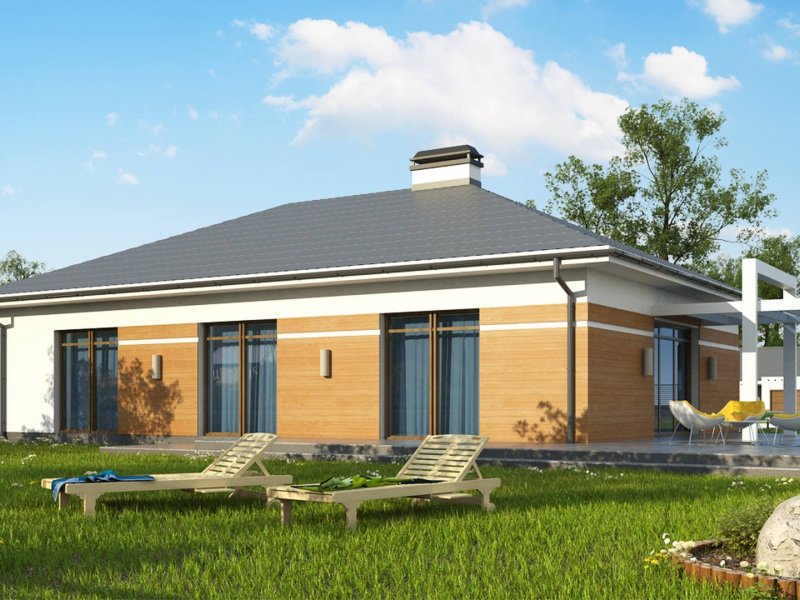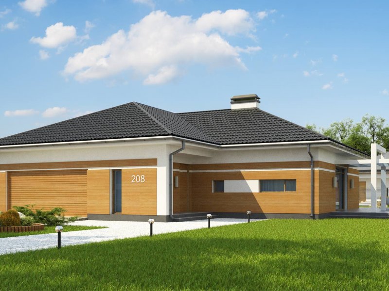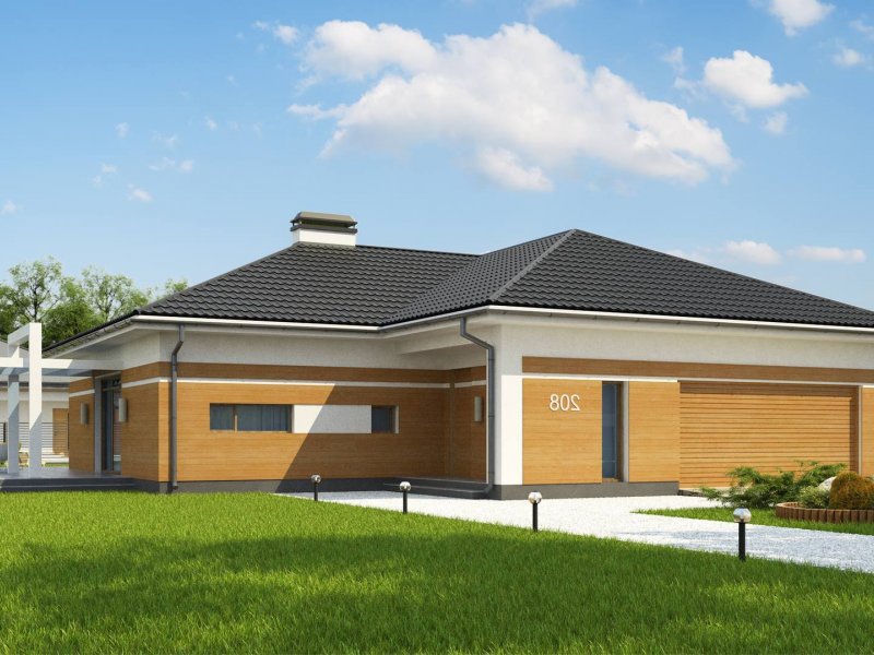 Projekt Z208 A to funkcjonalny, atrakcyjny parterowy dom z garażem na dwa samochody. Elewacje wyróżniają się nowoczesną, aczkolwiek spokojną i wyważoną architekturą z oryginalnymi dodatkami. Wnętrze posiada bogaty i przemyślany program funkcjonalny. Strefy dzienną oraz nocną wyraźnie wydzielono, co podnosi komfort użytkowania. Strefa ogólnodostępna to przestronny salon połączony z jadalnią oraz kuchnią. Znalazło się tu miejsce na podręczną spiżarkę oraz niewielką łazienkę. W części nocnej zaprojektowano trzy wygodne sypialnie, z miejscem na pojemne szafy oraz dużą łazienkę.