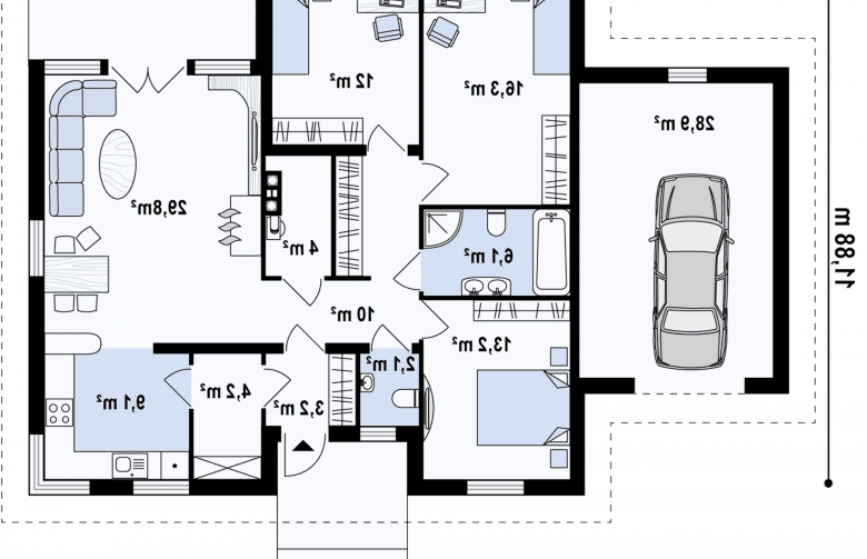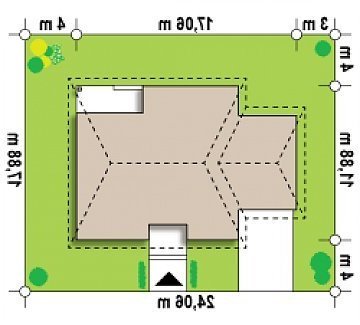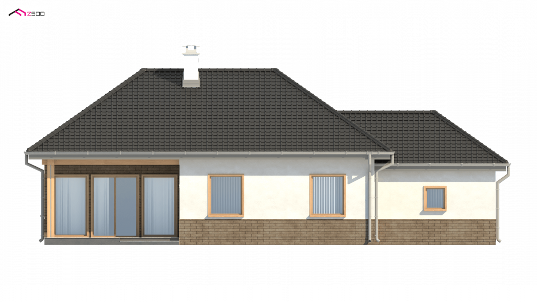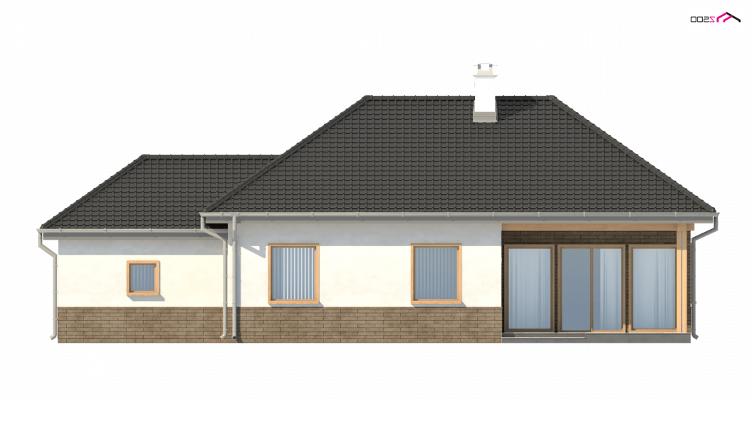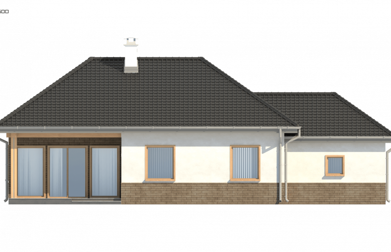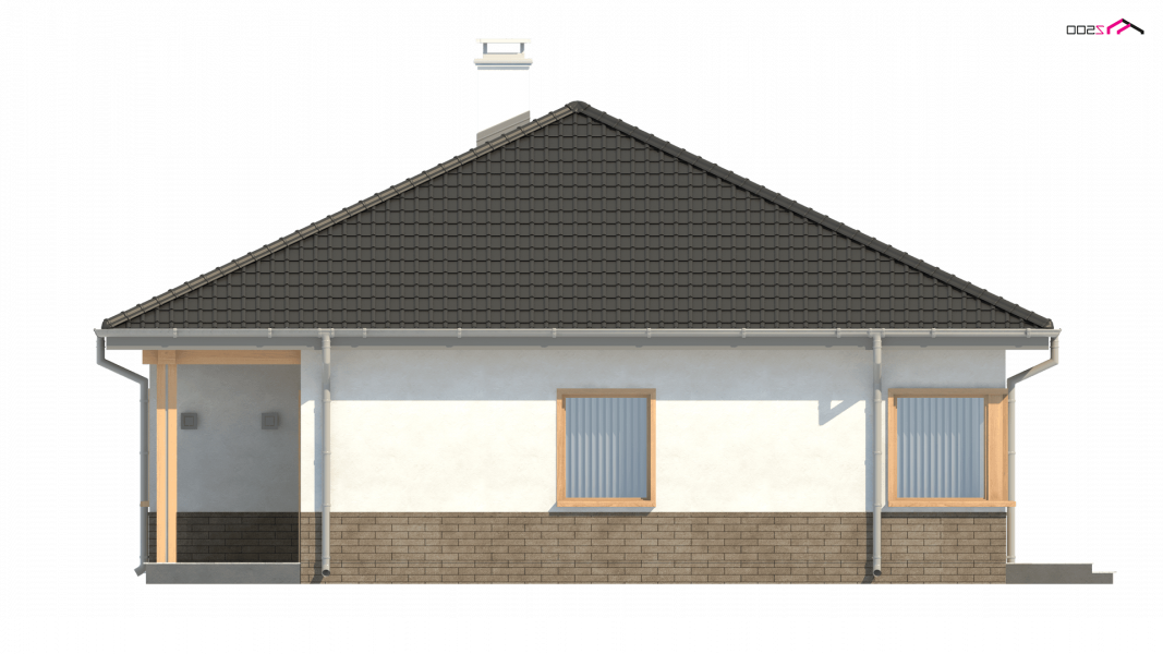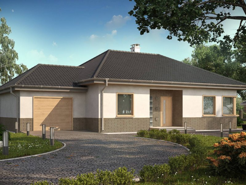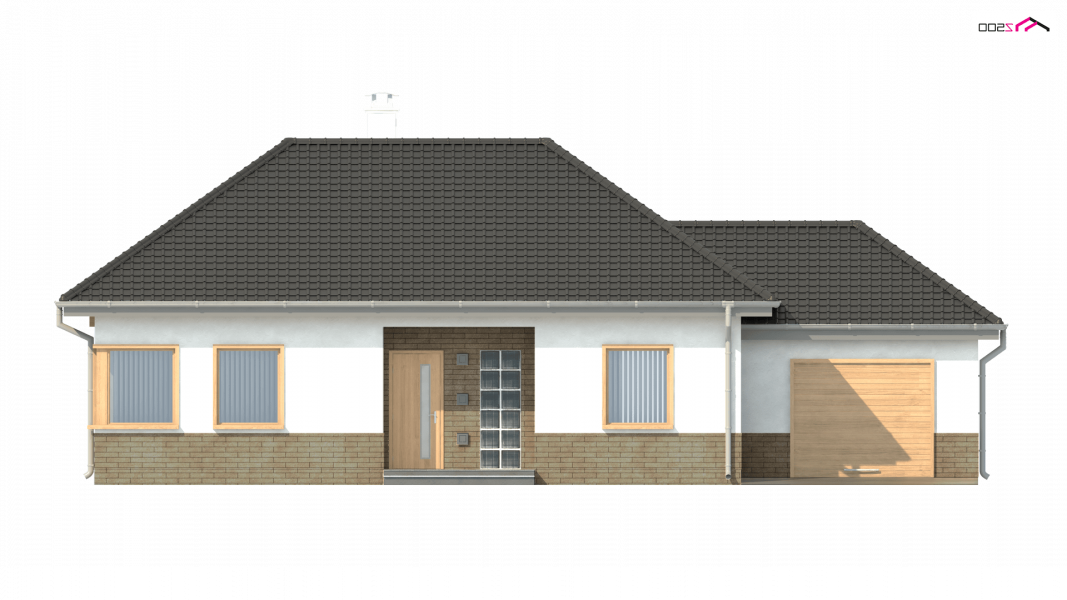 Wariant domu z garażem po lewej stronie (pow 29,15m2). Garaż jest dodatkowo poszerzony (szer. 4,10m); przewidziano w nim przestrzeń gospodarczą. Istnieje możliwość zrobienia przejścia bezpośrednio z garażu do domu kosztem pomniejszenia łazienki lub sypialni.