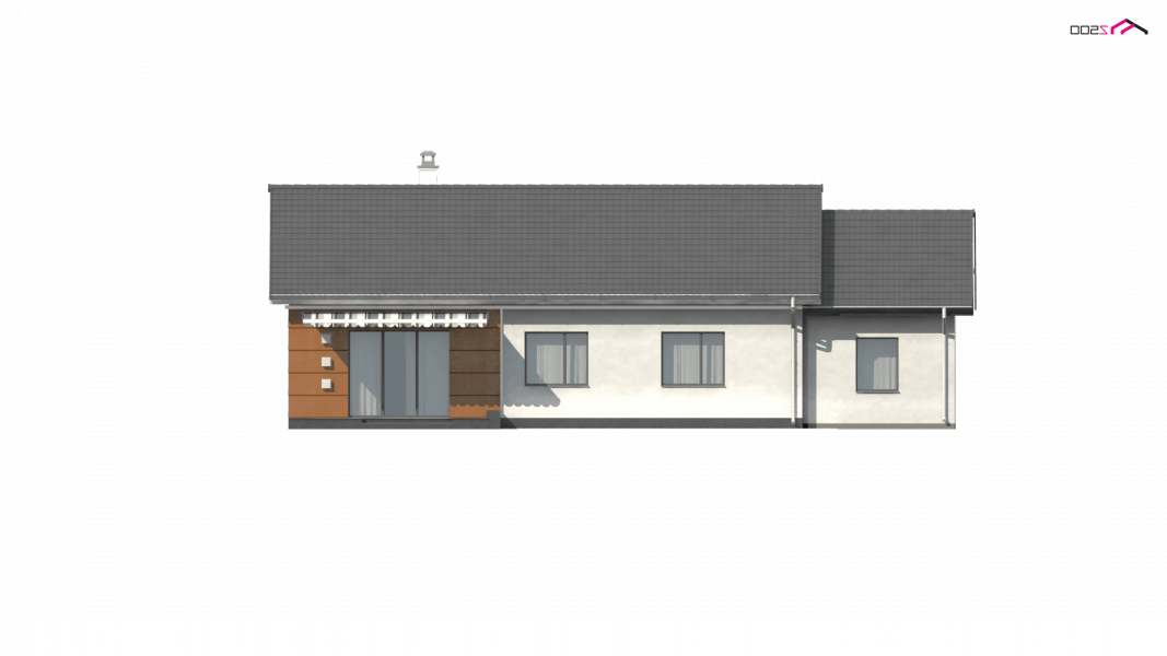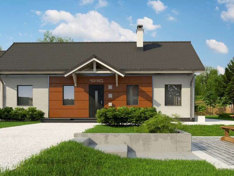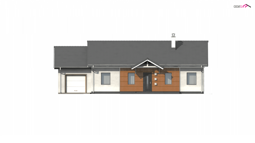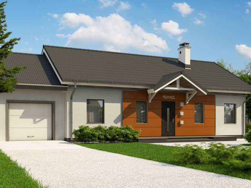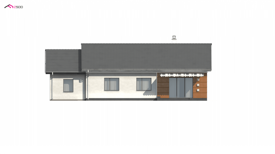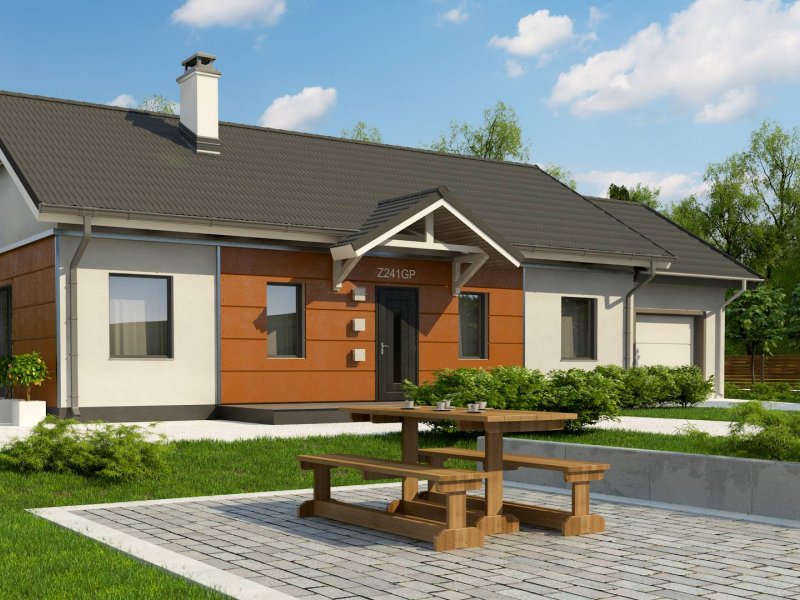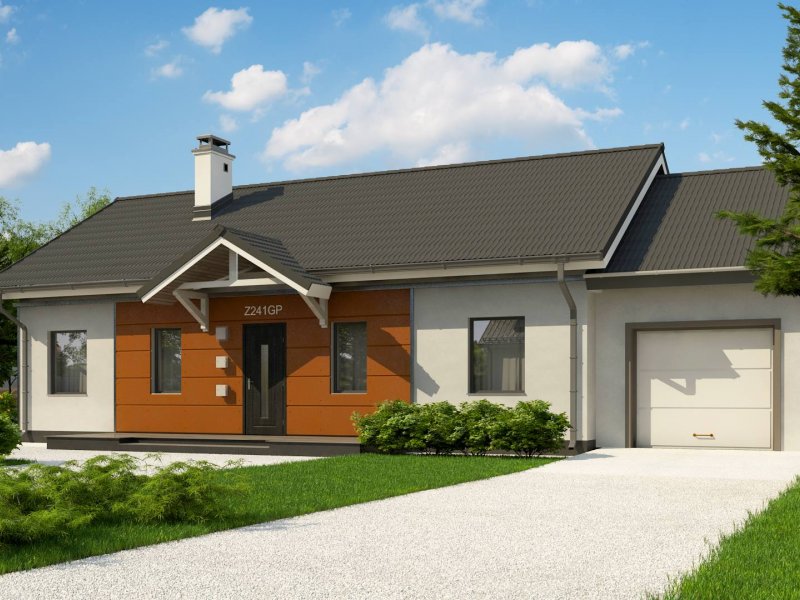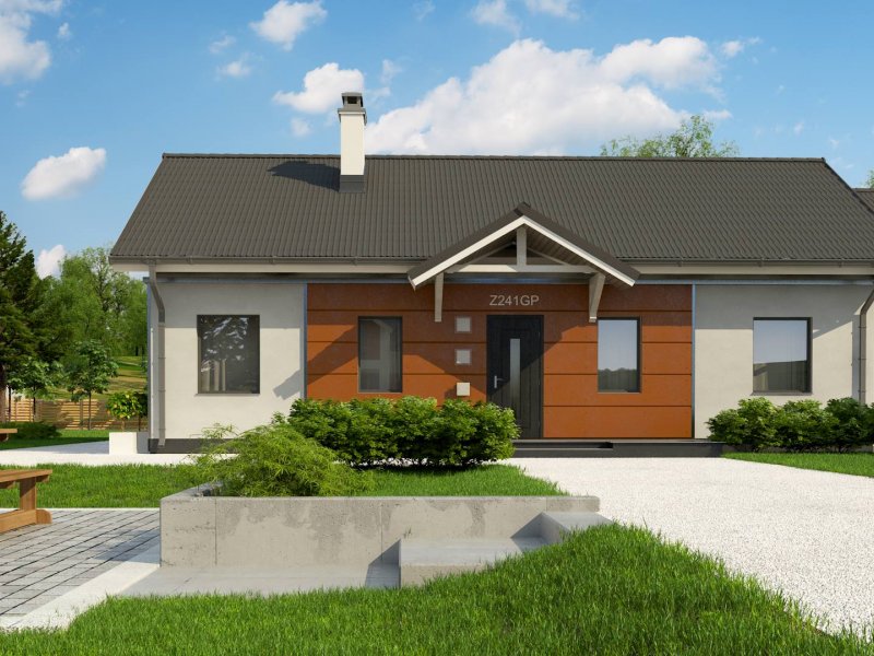 Z241 GP to projekt domu parterowego z dachem dwuspadowym. Prost bryła oraz ciekawe połączenie różnych materiałów na elewacji nadaje mu niepowtarzalny wygląd.