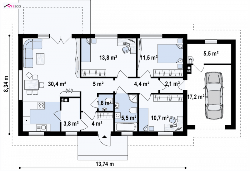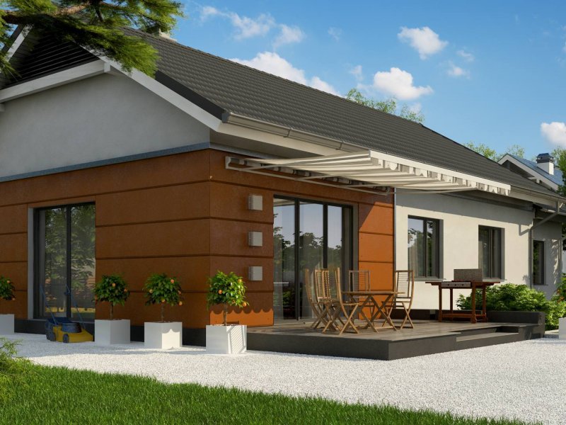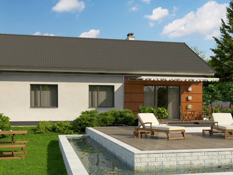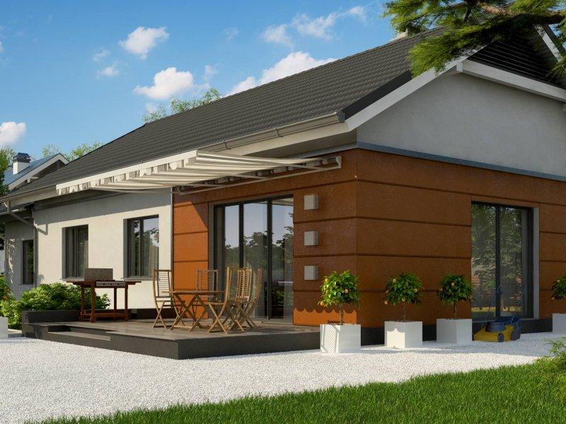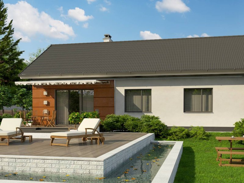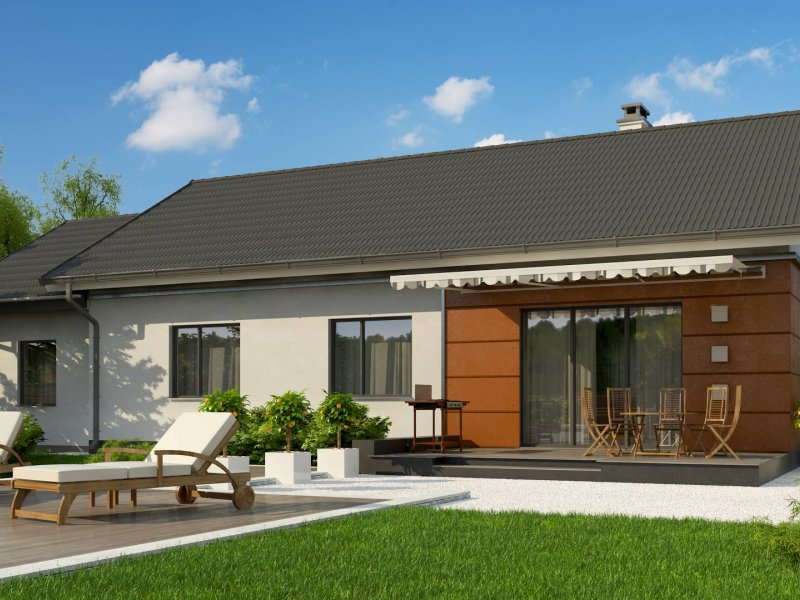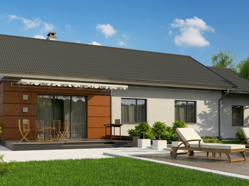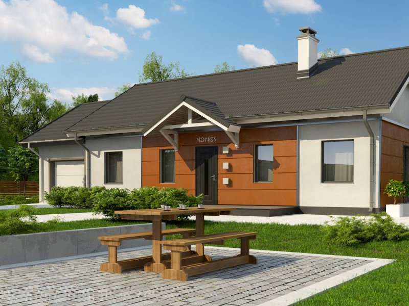 Z241 GP to projekt domu parterowego z dachem dwuspadowym. Prost bryła oraz ciekawe połączenie różnych materiałów na elewacji nadaje mu niepowtarzalny wygląd.