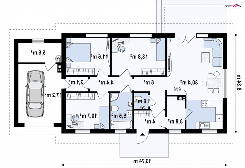 Wariant z garażem jednostanowiskowym po prawej stronie.