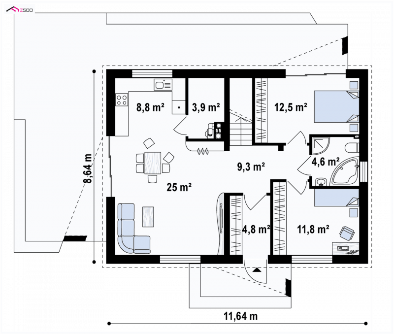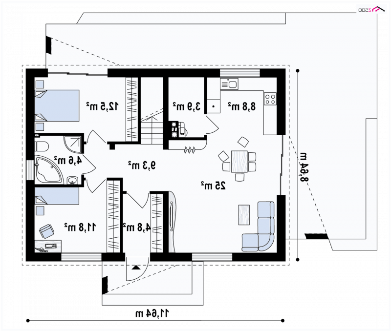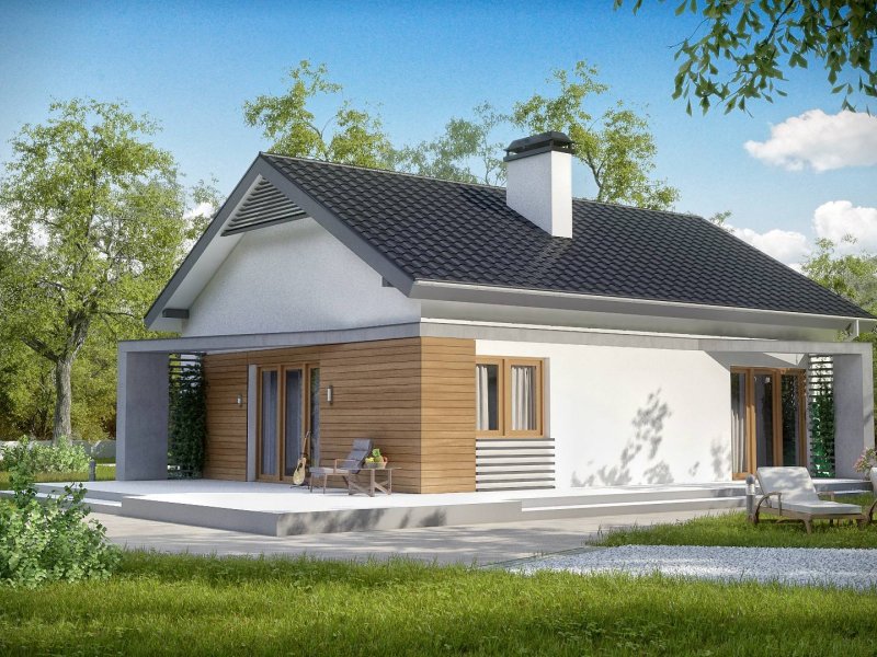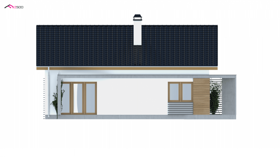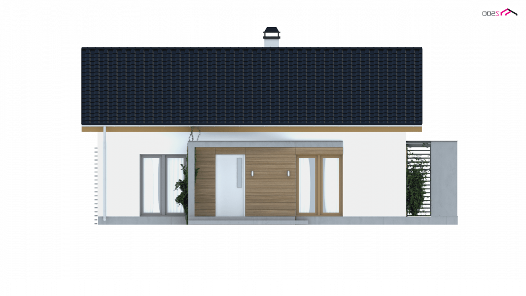 Prostota i praktyczne rozmieszczenie pomieszczeń nadają mu iście sielskiego klimatu. Znajdują się w nim dwie sypialnie, łazienka oraz kuchnia z pokojem dziennym prowadzącym na taras. Strefę dzienną tworzy kuchnia z jadalnią i przestronny pokój dzienny. Dodatkowo, zaprojektowano tu duże pomieszczenie gospodarcze. W strefie nocnej znajdują się dwie sypialnie oraz obszerna łazienka. Czytelny podział funkcjonalny i wyraźne odseparowanie strefy dziennej i nocnej sprawiają, że dom wyróżnia wyjątkowy komfort użytkowania. Z255 jest przykładem harmonijnego połączenia tradycyjnej formy oraz nowoczesnych detali. Jego prosta bryła z dwuspadowym dachem sprawia, że dom jest ekonomiczny w realizacji. Słoneczny charakter domu podkreślają duże przeszklenia oraz atrakcyjne kolory i materiały, zastosowane na elewacji.