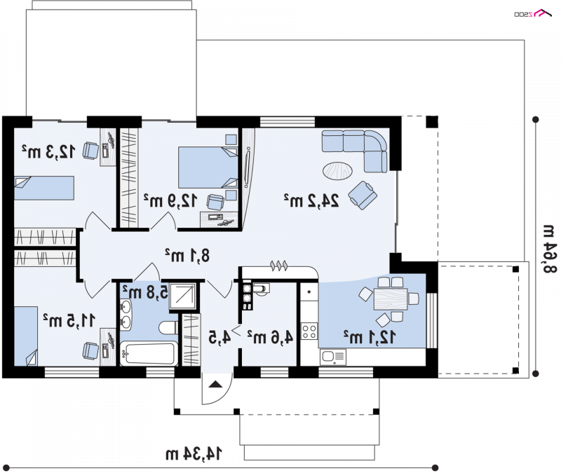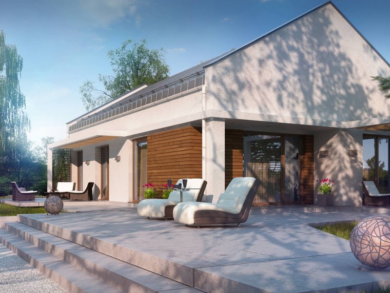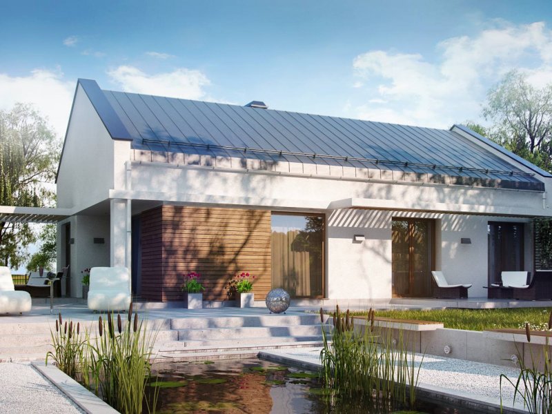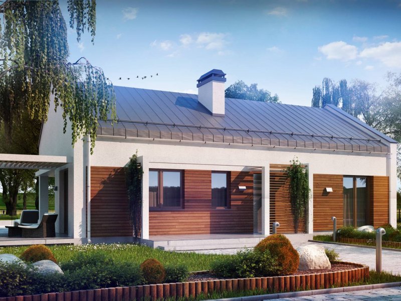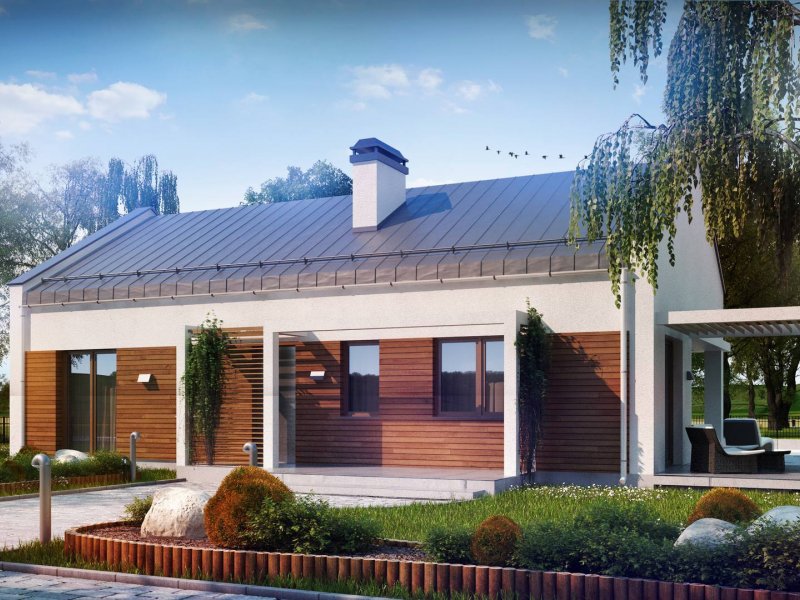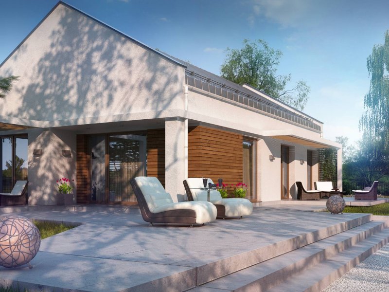 Projekt domu Z258 to propozycja dla inwestorów szukających projektu oryginalnego, ale jednocześnie nawiązującego do tradycji. Pozbawiony okapów dwuspadowy dach i nieco podniesione w stosunku do niego ściany szczytowe eksponują prosty, geometryczny kształt bryły. Od frontu urozmaica ją drewniana pergola, będąca jednocześnie zadaszeniem podestu wejściowego, a z boku pergola płynnie przechodząca w zadaszenie kuchni i jadalni.