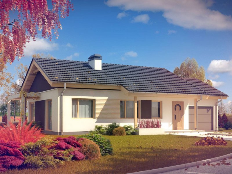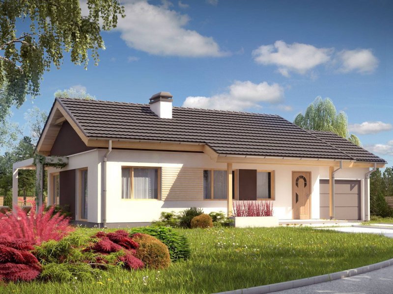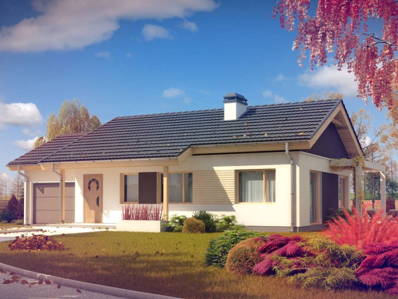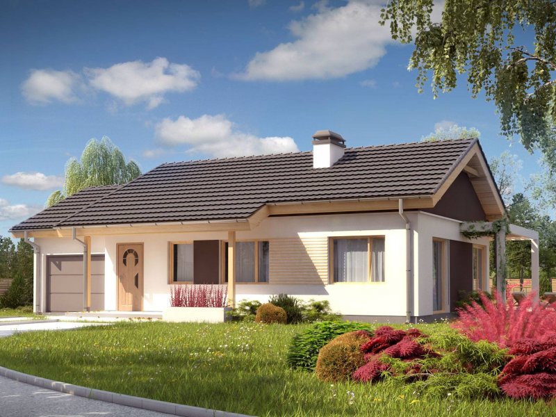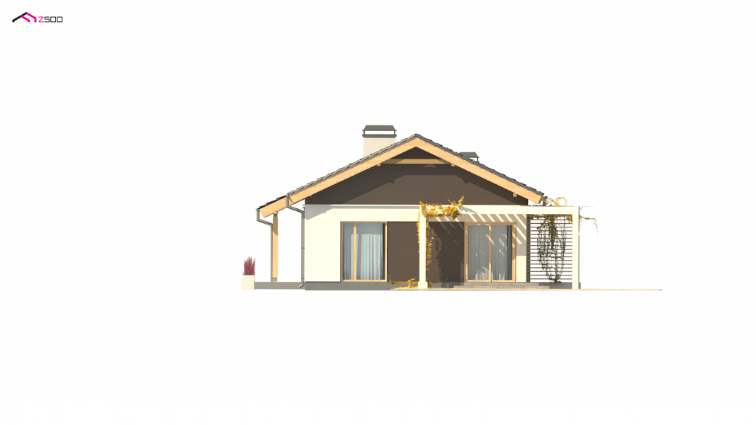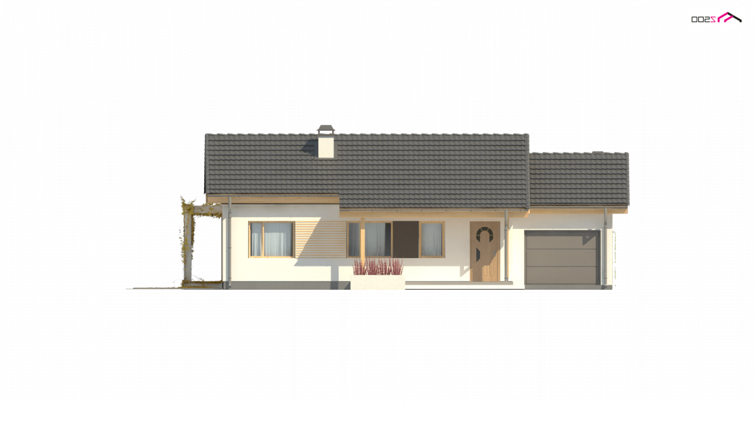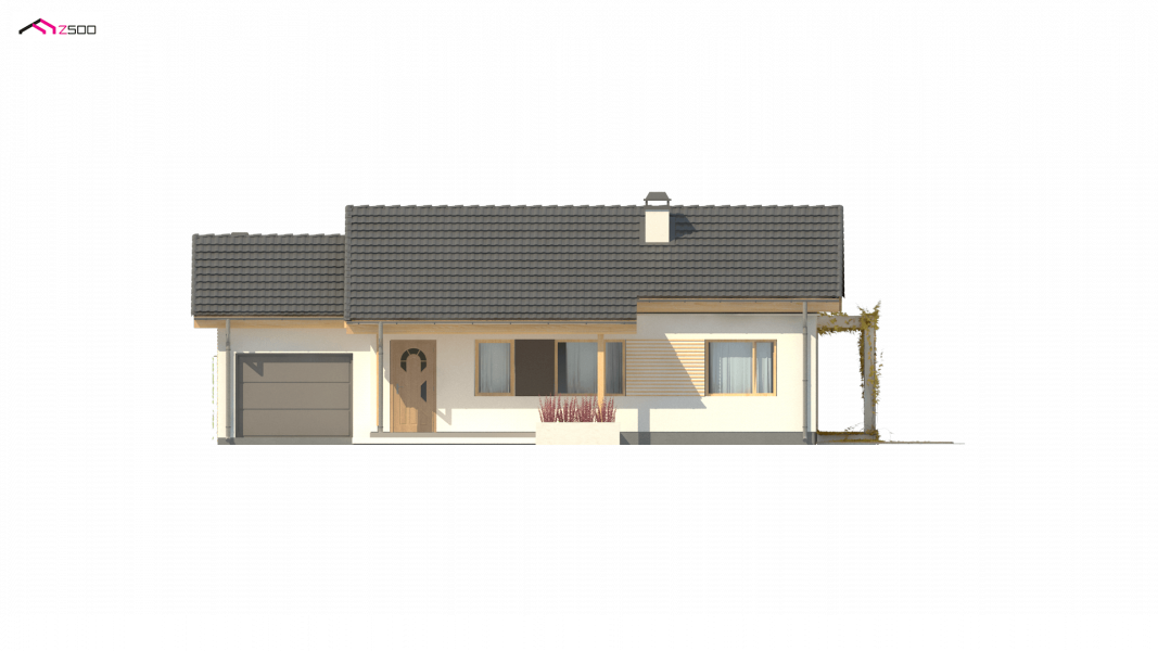 Z259 to propozycja wspaniałego domu parterowego z dwuspadowym dachem i garażem jednostanowieskowym. Wspaniale wkomponuje się w każdą, nawet niewielką działkę. Jasne barwy ścian doskonale współgrają z drewnianymi elementami elewacji i brązową dachówką.