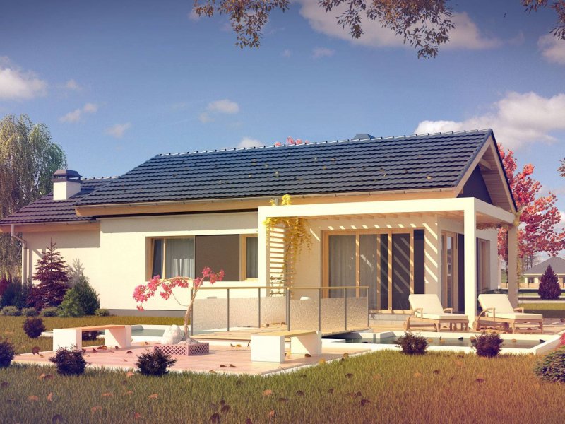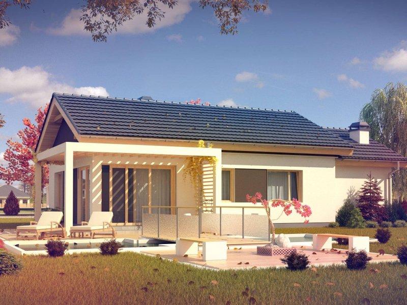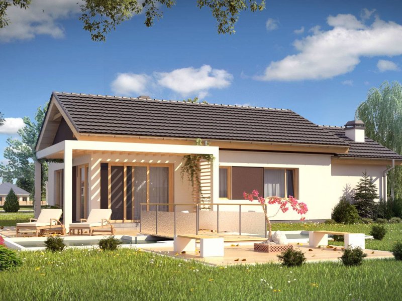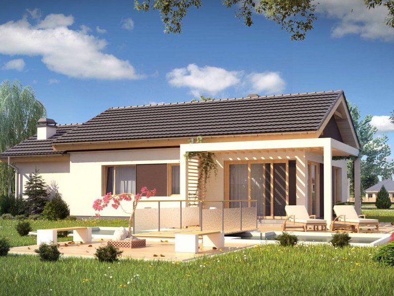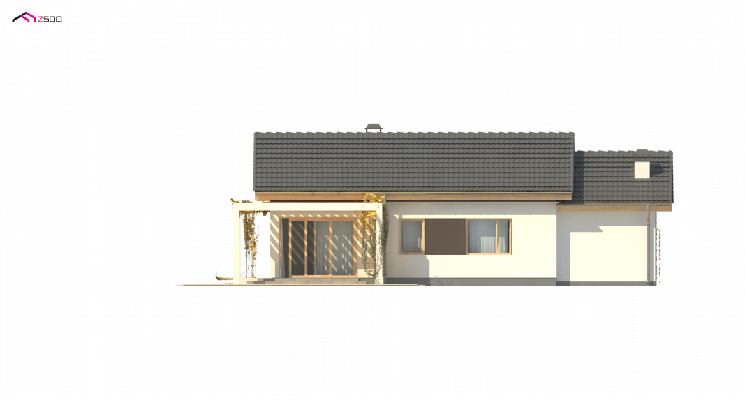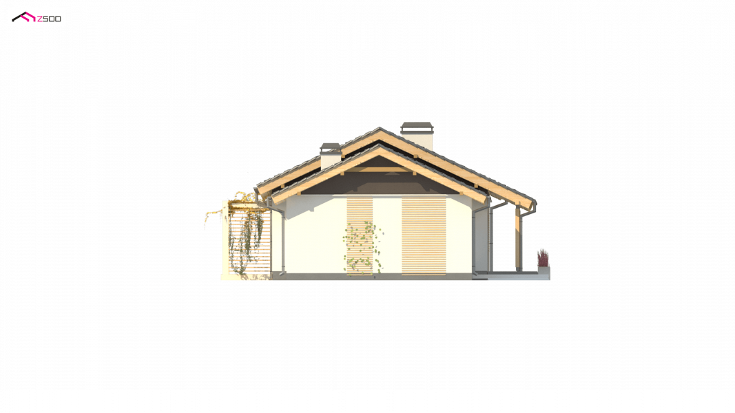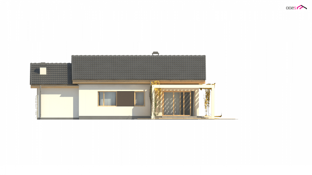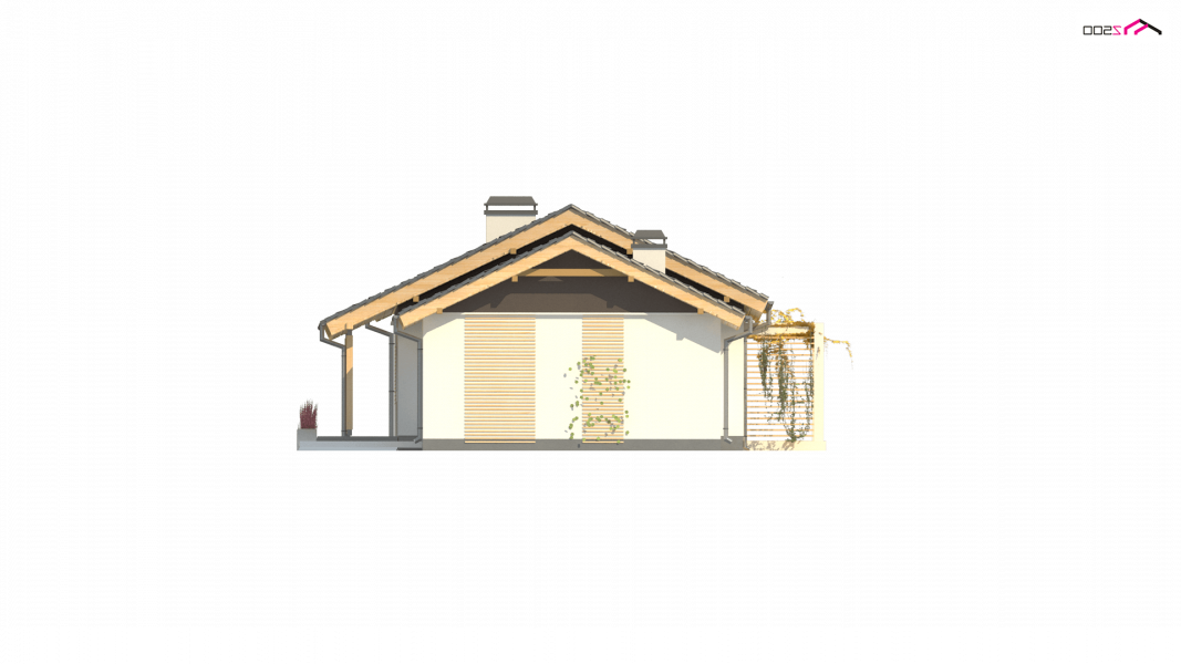 Z259 to propozycja wspaniałego domu parterowego z dwuspadowym dachem i garażem jednostanowieskowym. Wspaniale wkomponuje się w każdą, nawet niewielką działkę. Jasne barwy ścian doskonale współgrają z drewnianymi elementami elewacji i brązową dachówką.