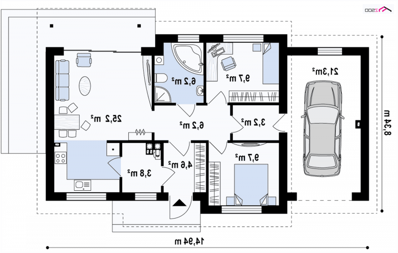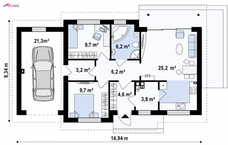Z262 to wyjątkowy i jednocześnie skromny dom, który wkomponuje się w każdy krajobraz i typ działki. Jest on doskonały dla osób ceniących funkcjonalne rozmieszczenie pomieszczeń na jednym poziomie i niewielkiej powierzchni