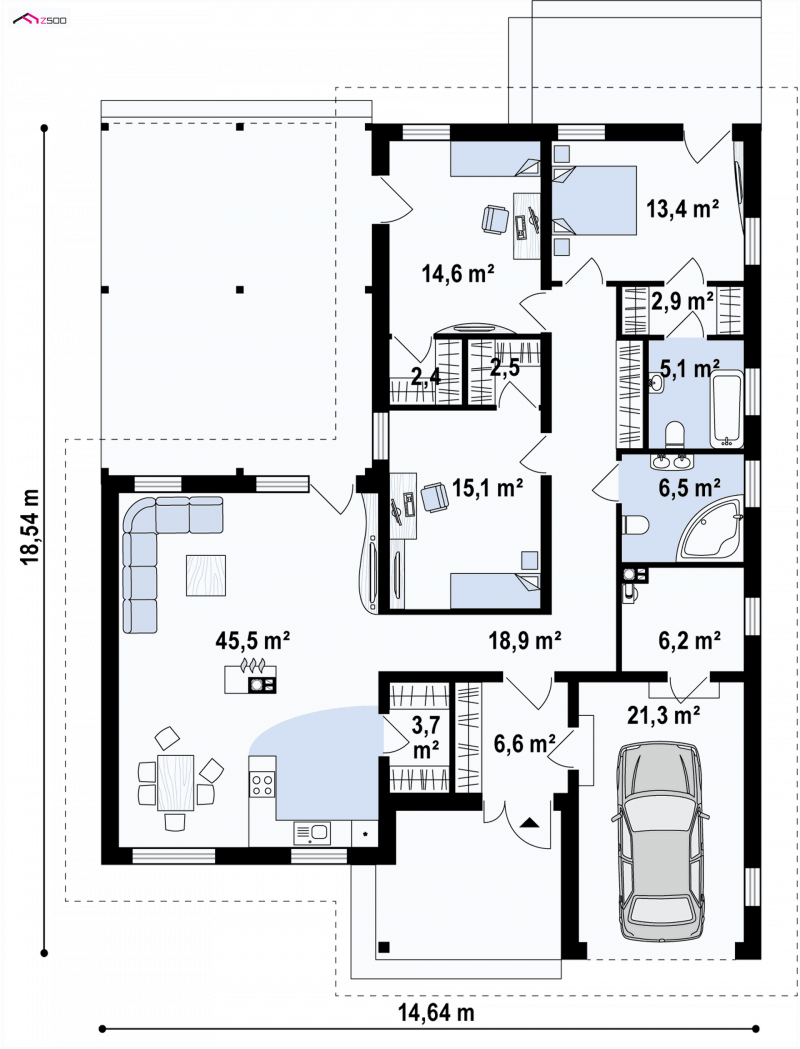 Projekt Z280 spodoba się wszystkim tym, którzy poszukują domu z funkcjonalnym rozwiązaniem pomieszczeń na jednym poziomie.