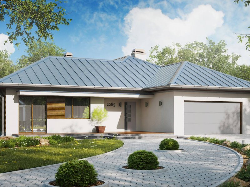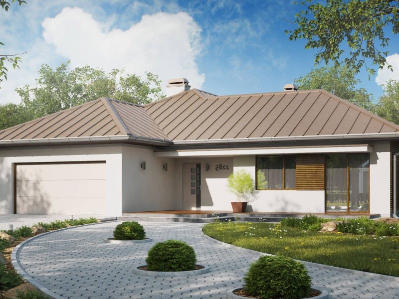 Projekt Z285 to propozycja domu parterowego z garażem dwustanowiskowym. Jasny tynk na elewacji dobrze współgra z szarymi dodatkami i popielatą blachodachówką.