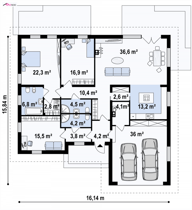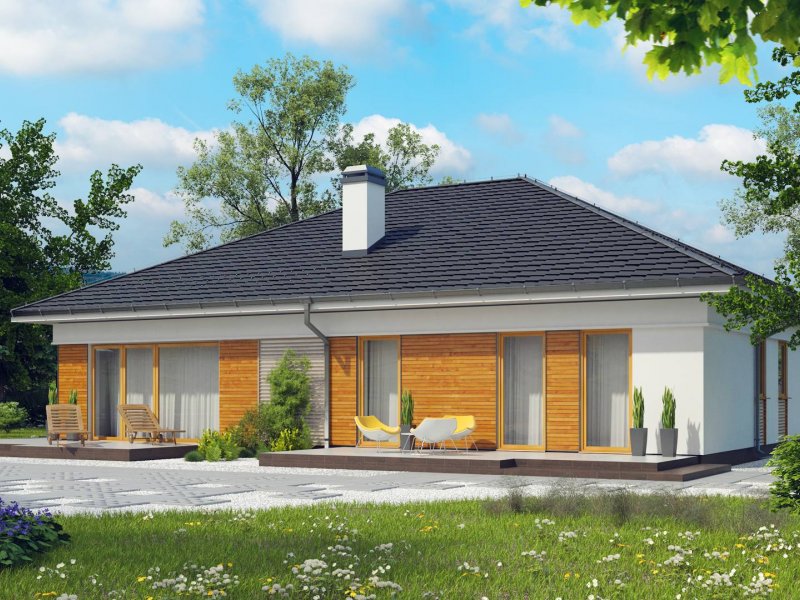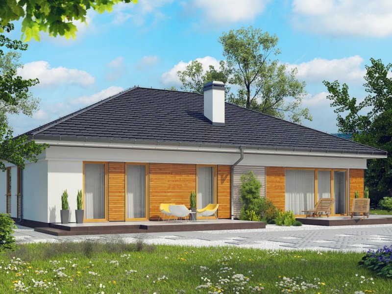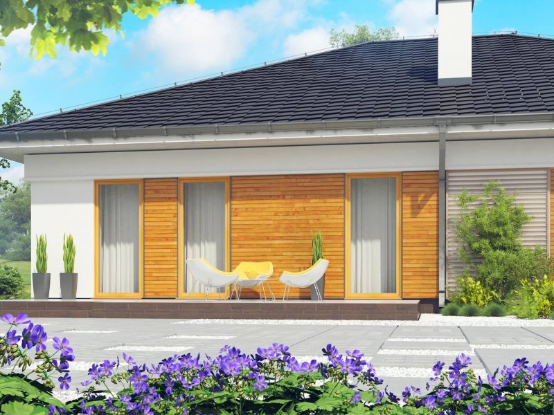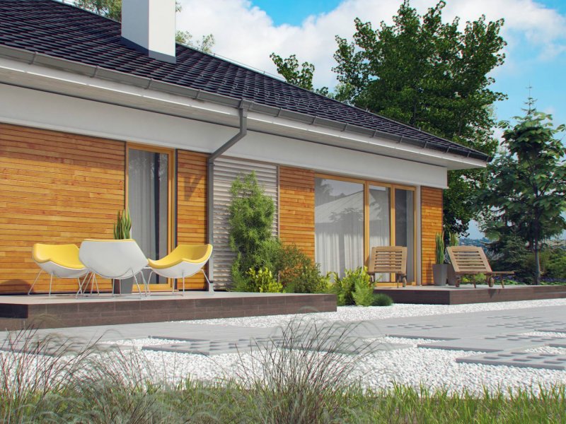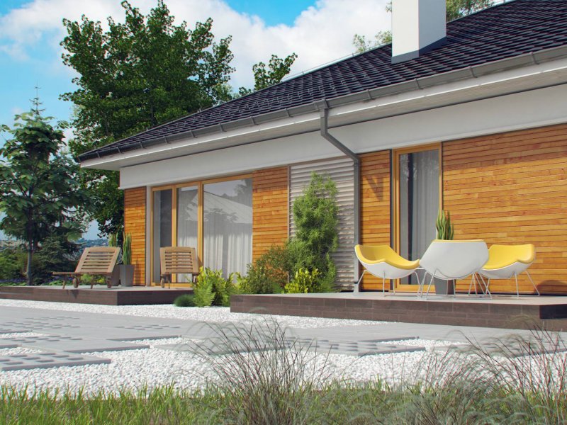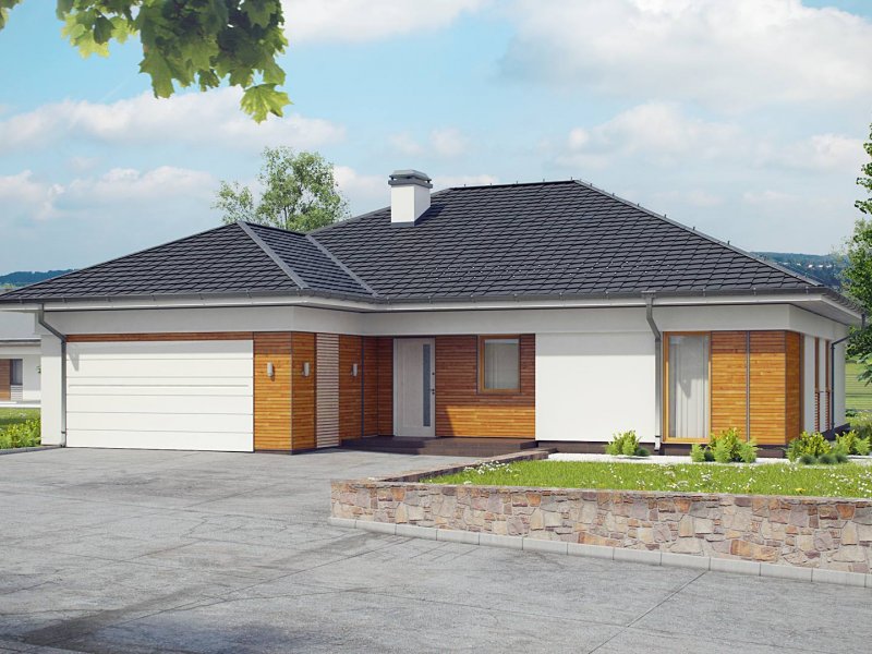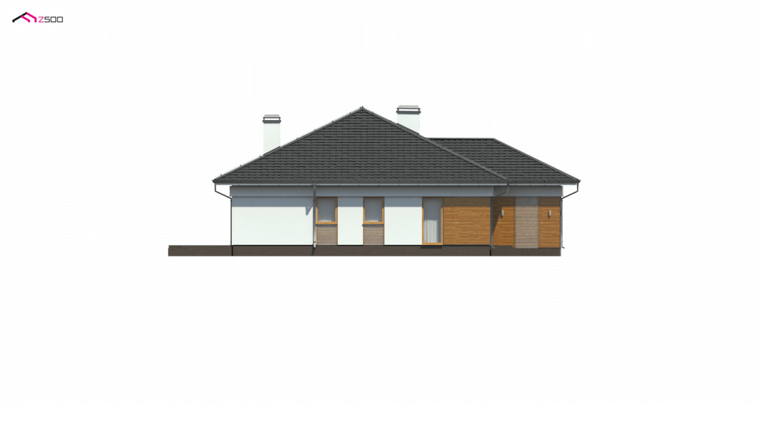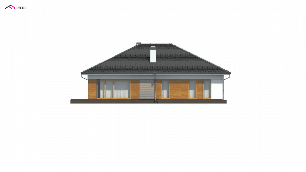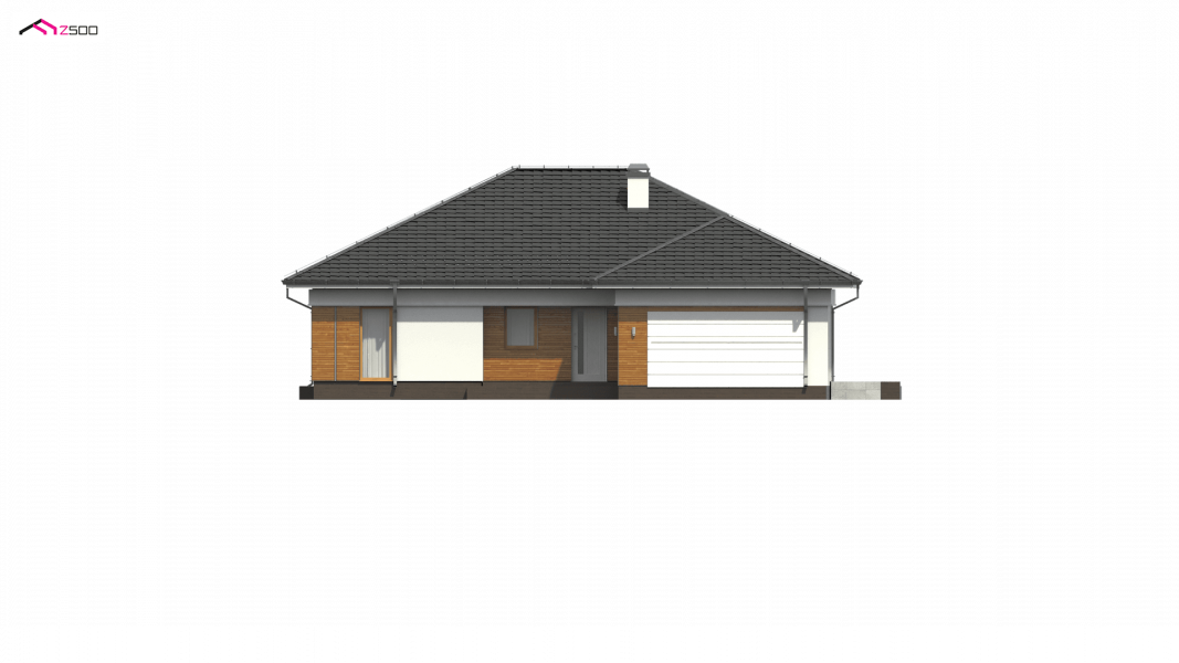 Z303 to dom współczesny, parterowy z możliwością zaaranżowania piętra. Elewacje utrzymane są w jasnej kolorystyce z drewnianymi elementami wykończenia, co nadaje mu niepowtarzalnego wyglądu. Główną zaletą domu jest duży garaż dwustanowiskowy z bezpośrednim przejściem do domu.