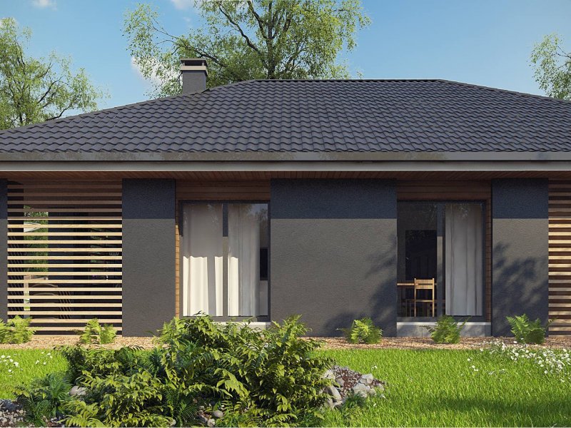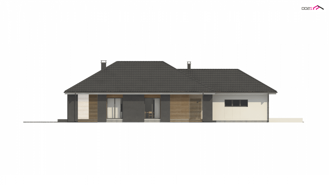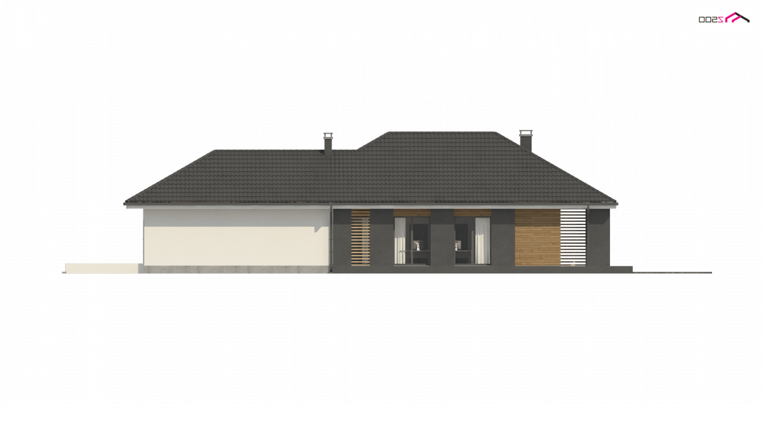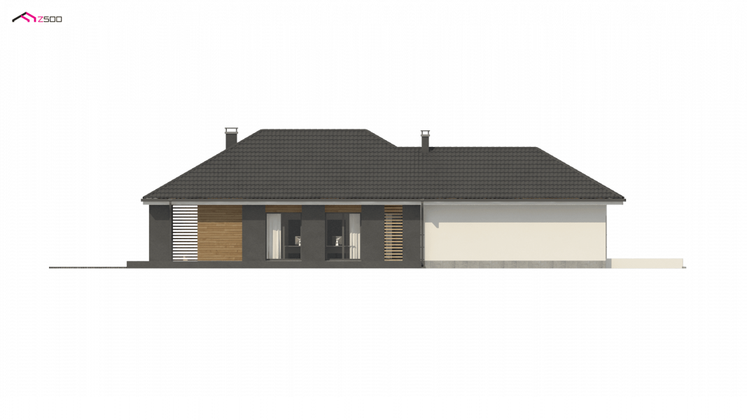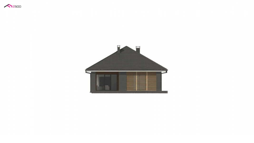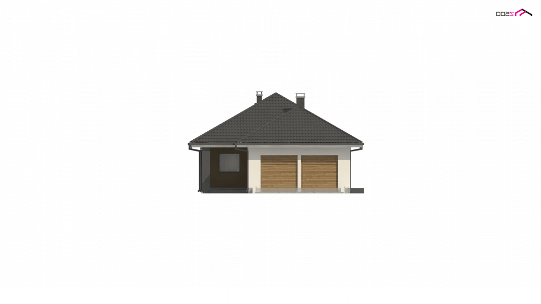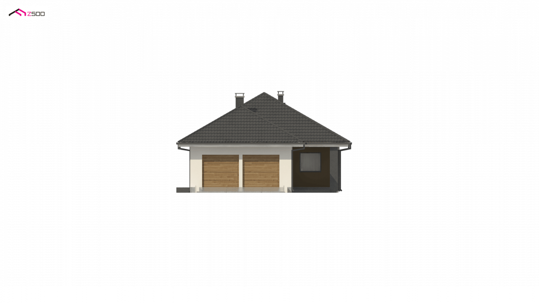 Z327 to parterowy dom w nowoczesnym stylu z garażem dwustanowiskowym i tradycyjnym dachem wielospadowym. Chłodną białą elewację połączono z ciepłymi drewnianymi panelami. Pomieszczenie gospodarcze w którym znajduje się piec na paliwo stałe z powodzeniem można zmienić na ogrzewanie gazowe.