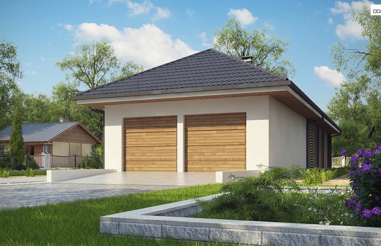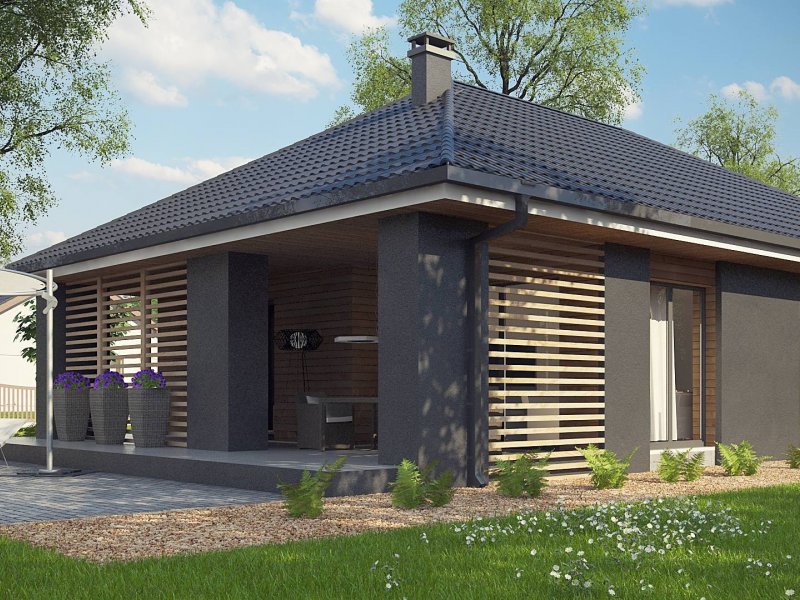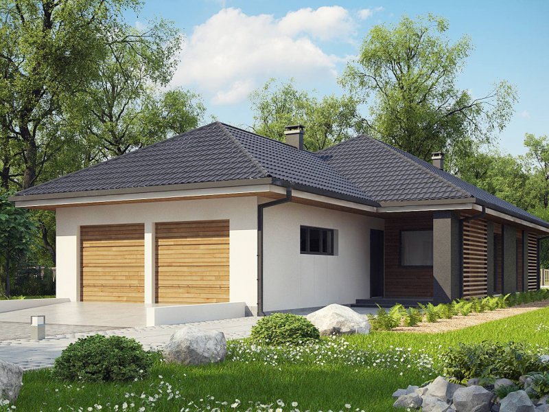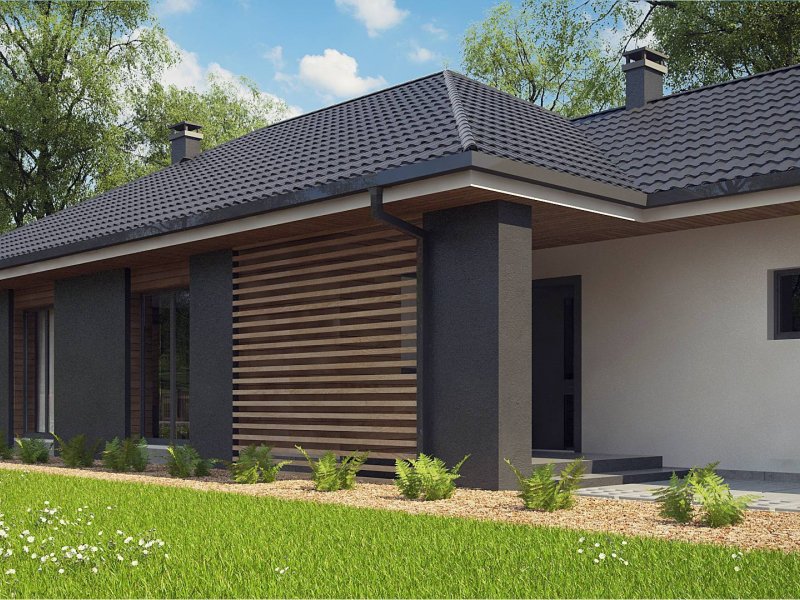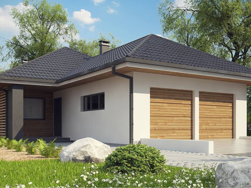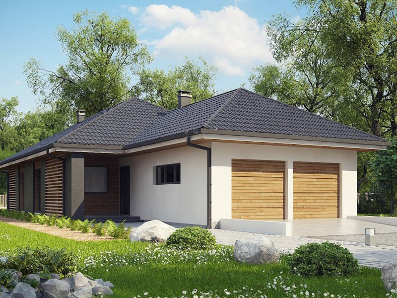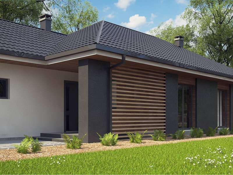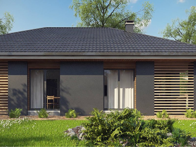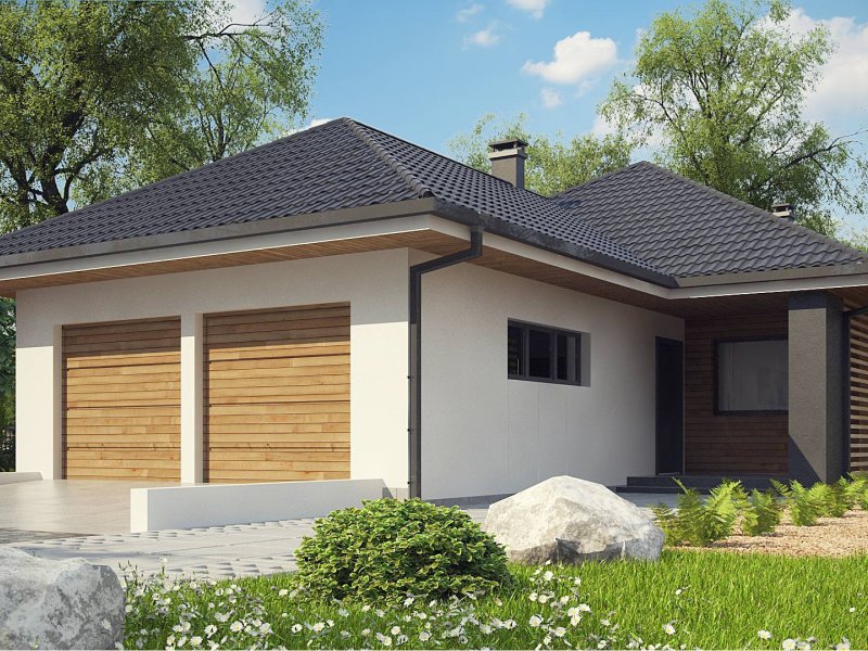 Z327 to parterowy dom w nowoczesnym stylu z garażem dwustanowiskowym i tradycyjnym dachem wielospadowym. Chłodną białą elewację połączono z ciepłymi drewnianymi panelami. Pomieszczenie gospodarcze w którym znajduje się piec na paliwo stałe z powodzeniem można zmienić na ogrzewanie gazowe.
