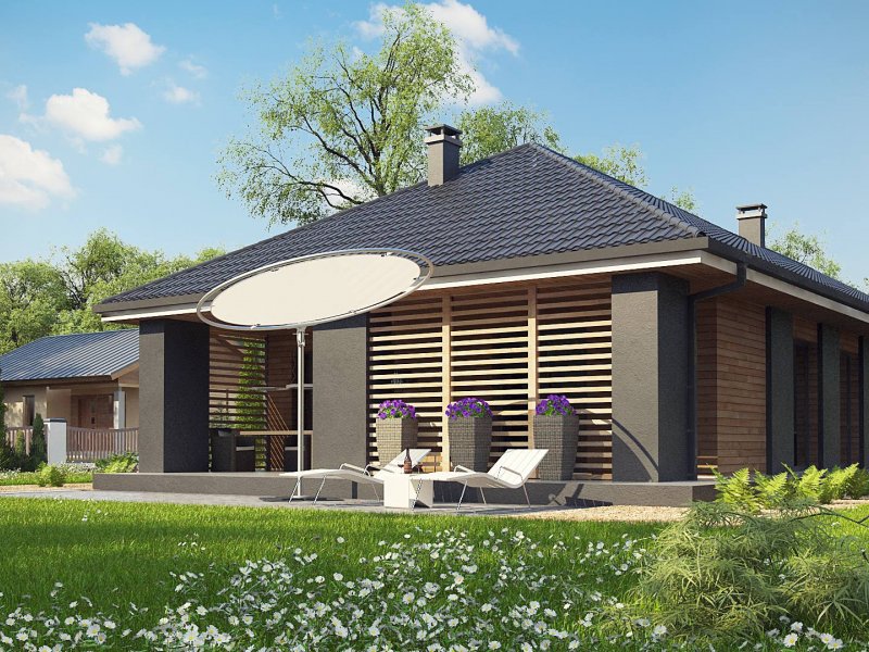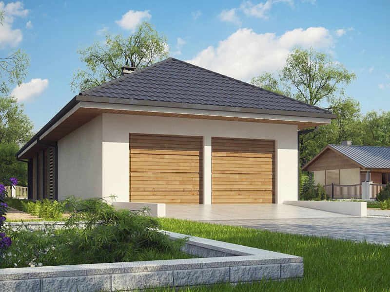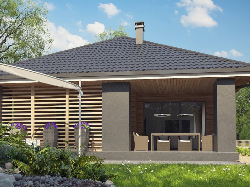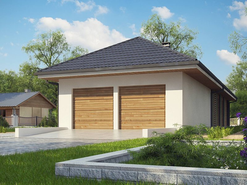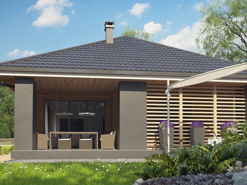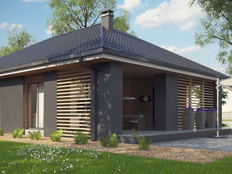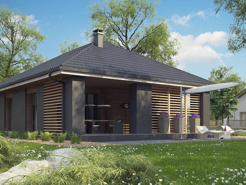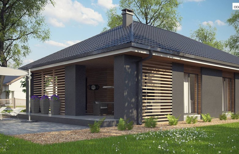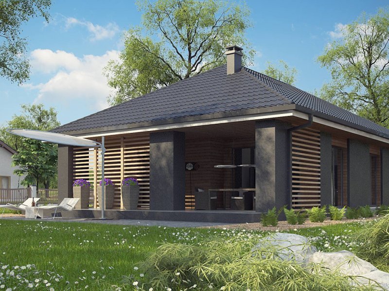 Z327 to parterowy dom w nowoczesnym stylu z garażem dwustanowiskowym i tradycyjnym dachem wielospadowym. Chłodną białą elewację połączono z ciepłymi drewnianymi panelami. Pomieszczenie gospodarcze w którym znajduje się piec na paliwo stałe z powodzeniem można zmienić na ogrzewanie gazowe.
