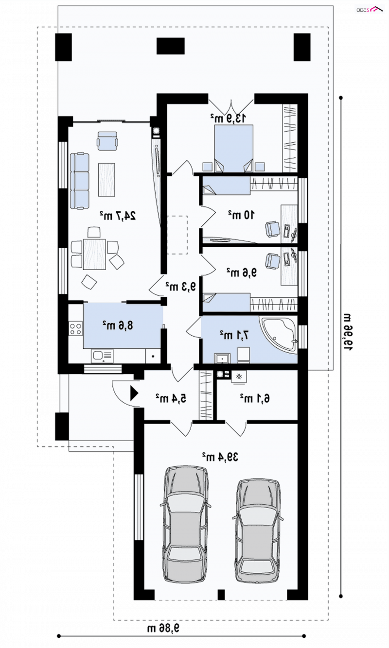 W projekcie wydzielono część dzienną z prawej strony i część nocną z lewej strony domu.