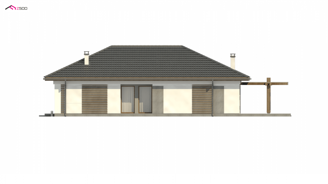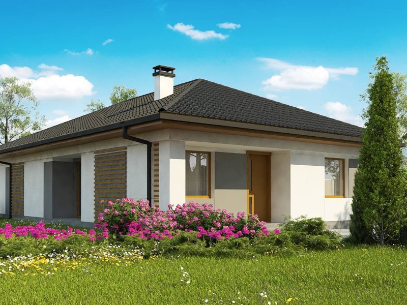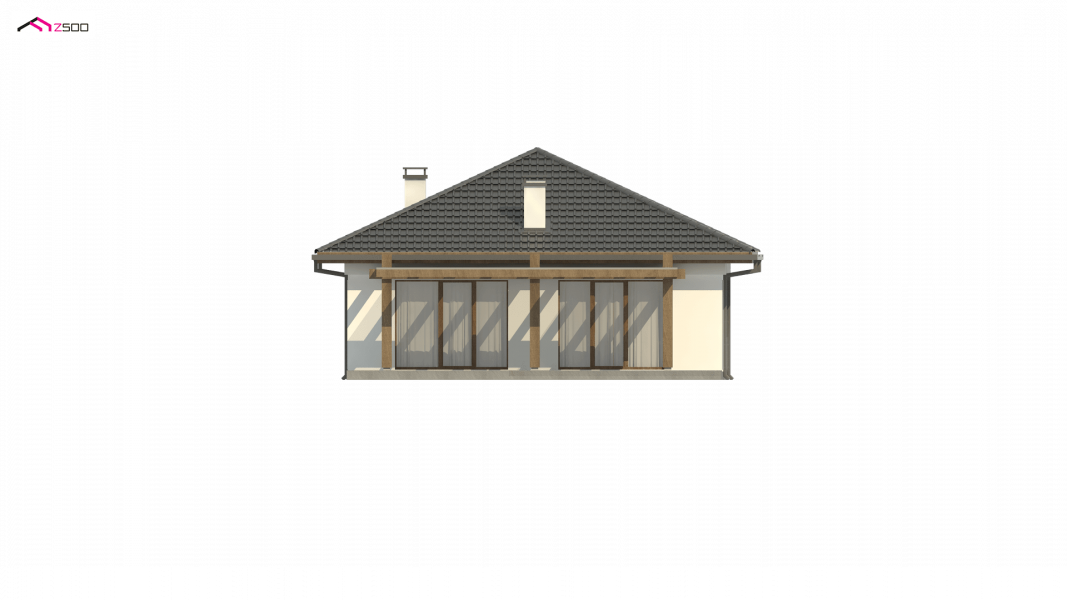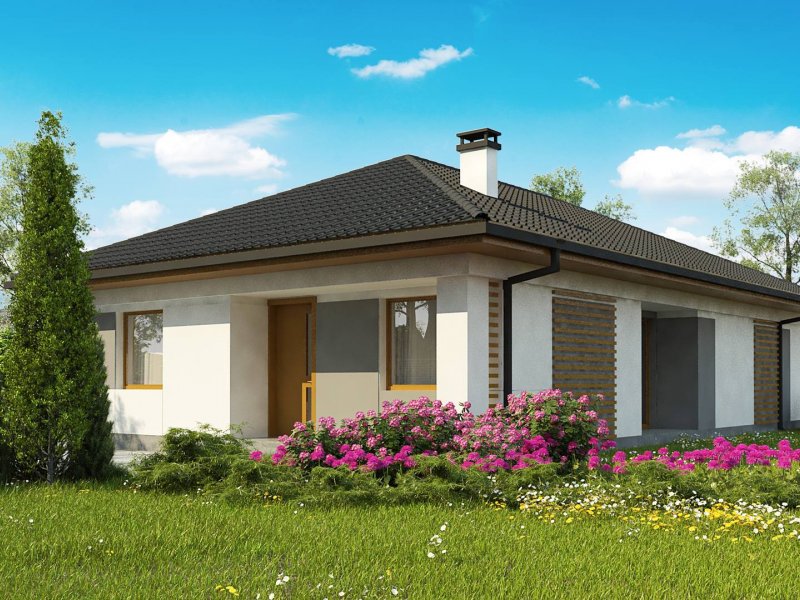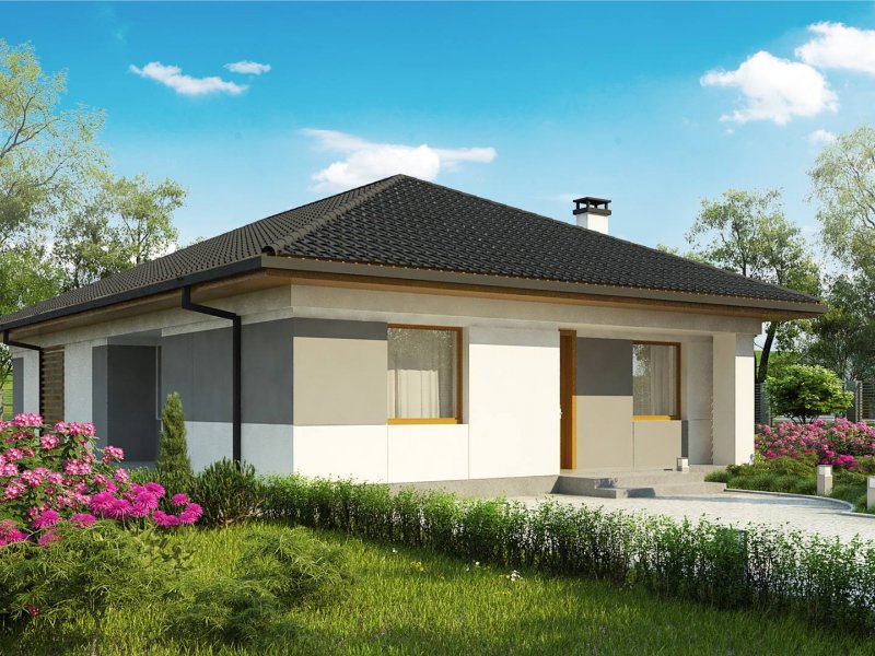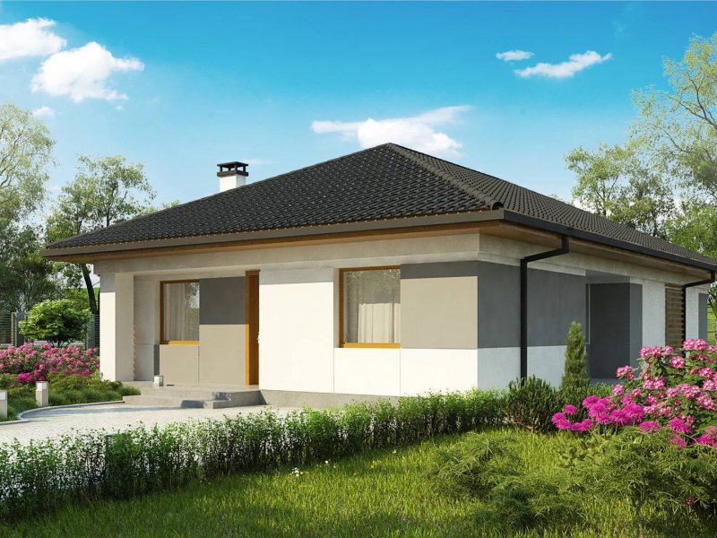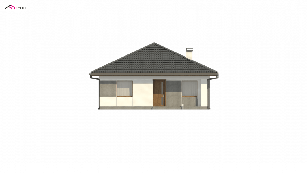 Z328 to nowoczesny parterowy dom z dachem kopertowym. Idealnie nadaje się na wąska działkę. Biała elewacja połączona z szarym tynkiem napawa wrażeniem surowej elegancji.