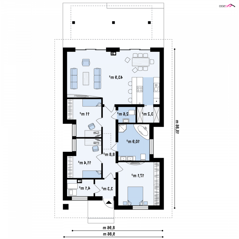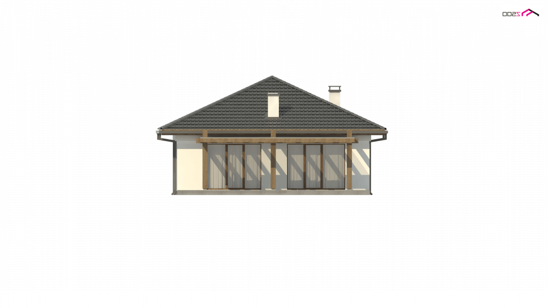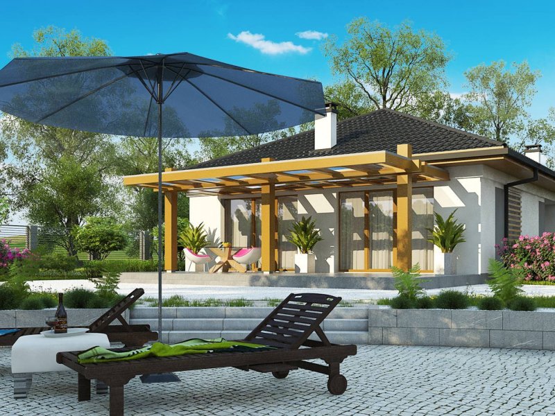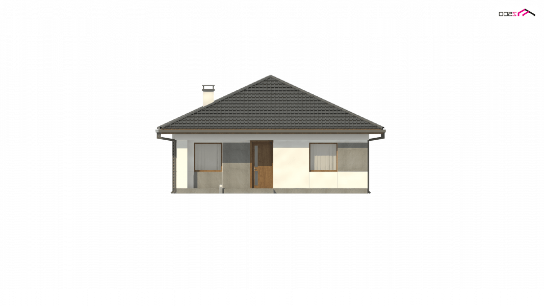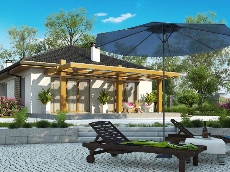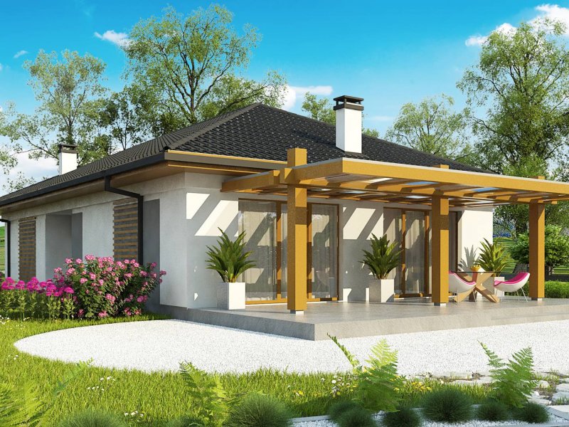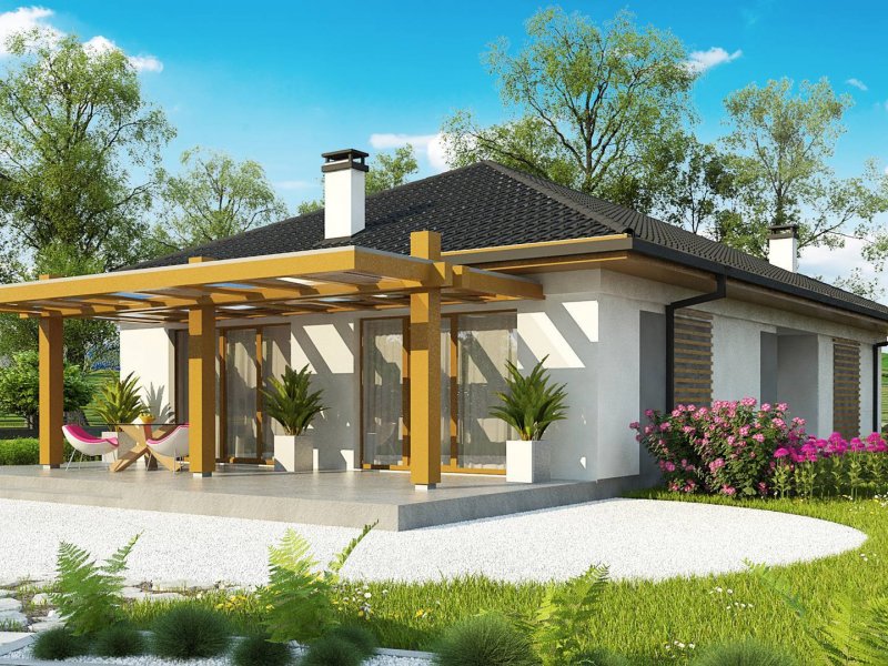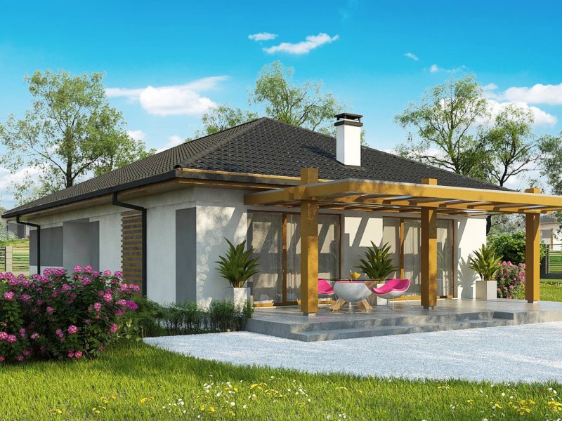 Z328 to nowoczesny parterowy dom z dachem kopertowym. Idealnie nadaje się na wąska działkę. Biała elewacja połączona z szarym tynkiem napawa wrażeniem surowej elegancji.