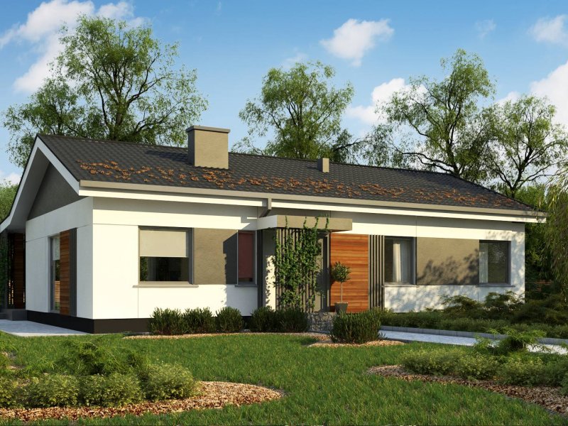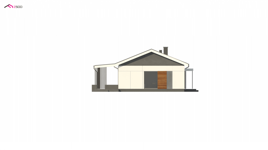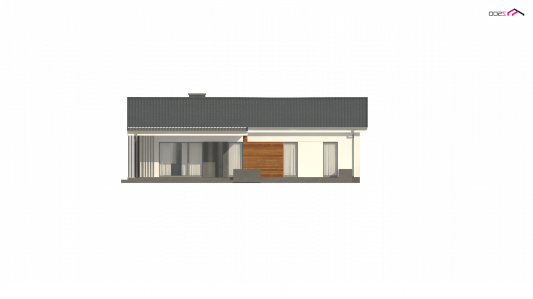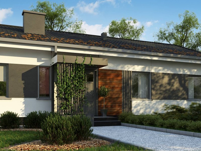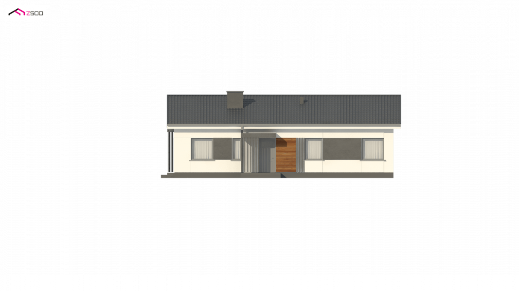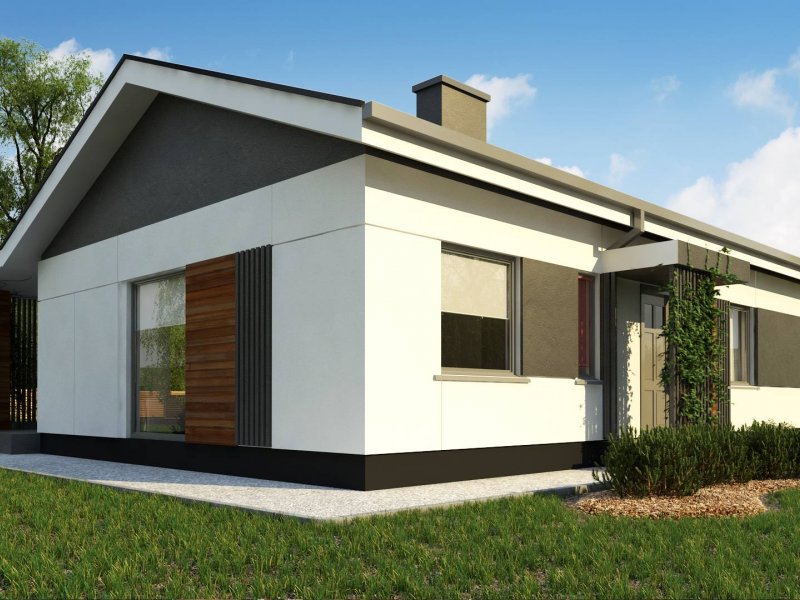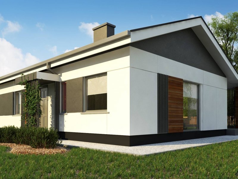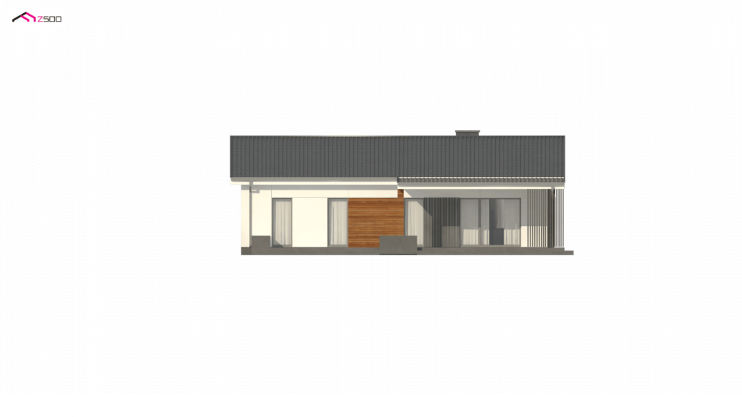 Propozycja parterowego domu z dachem dwuspadowym od Z500. Elewację wykończono prostymi elementami w postaci żaluzji, drewnianych paneli połączonych z elegancką bielą i szarością tynku.