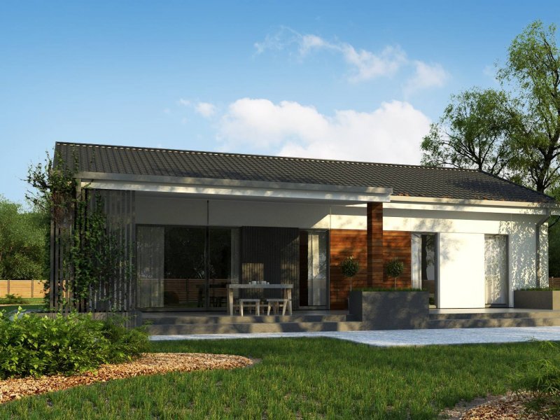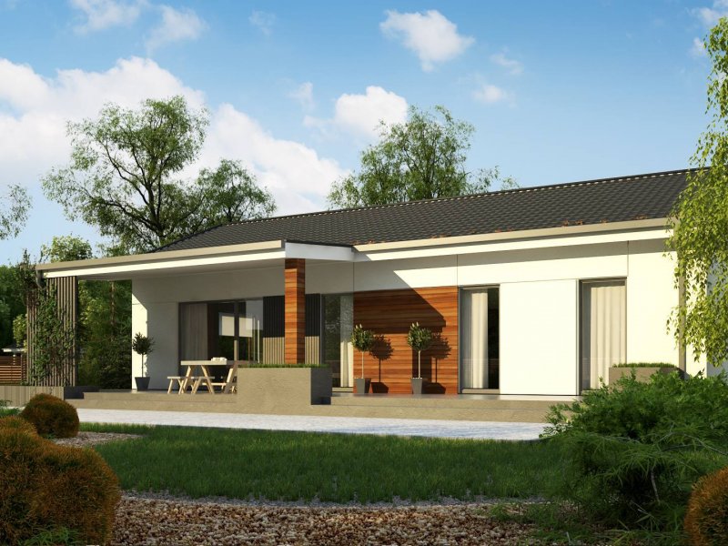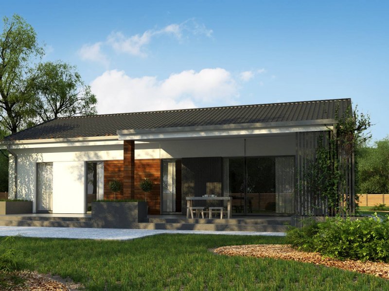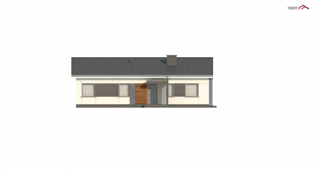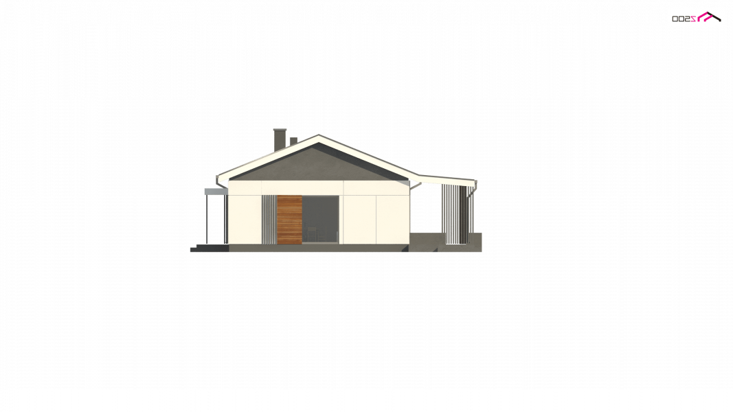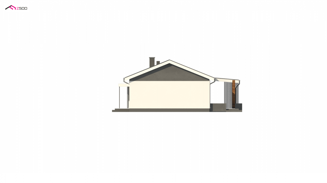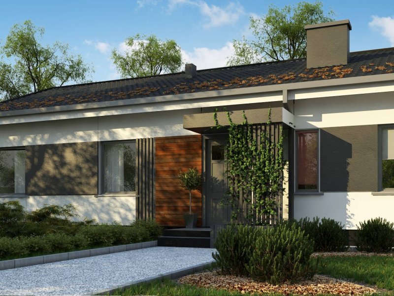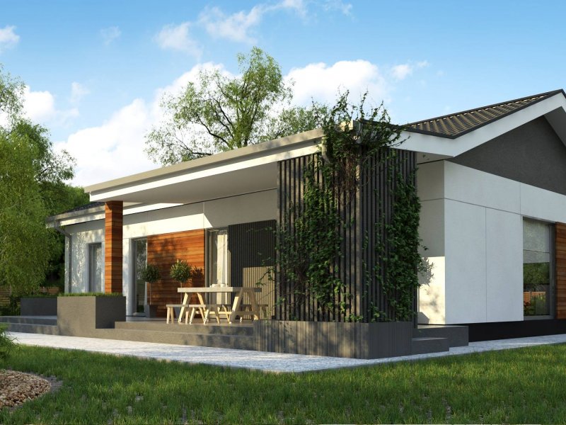 Propozycja parterowego domu z dachem dwuspadowym od Z500. Elewację wykończono prostymi elementami w postaci żaluzji, drewnianych paneli połączonych z elegancką bielą i szarością tynku.