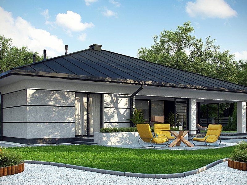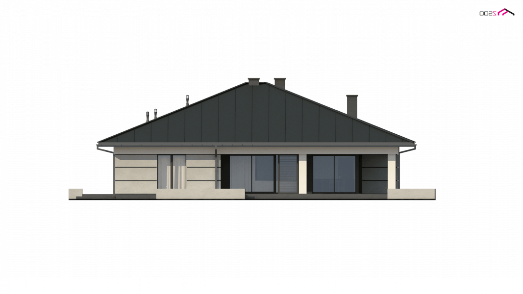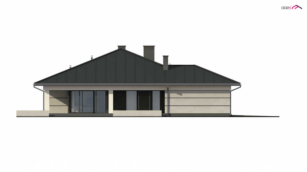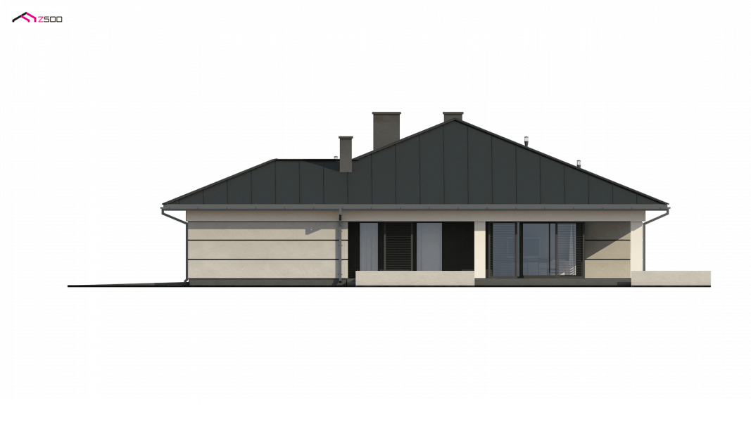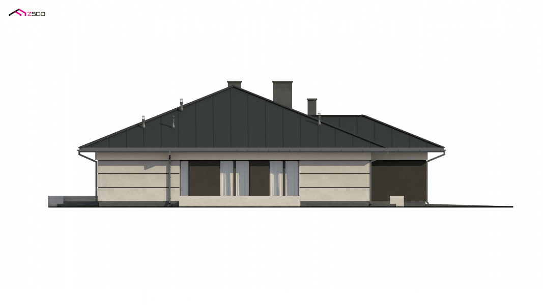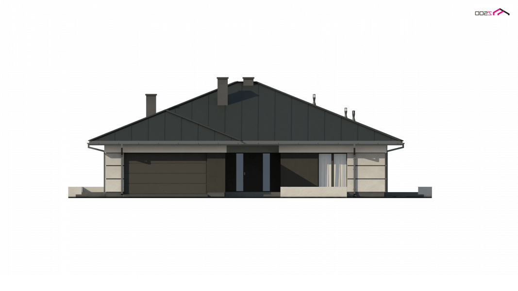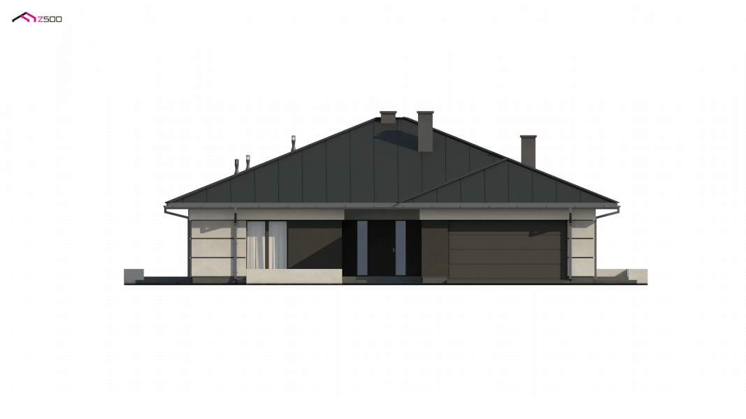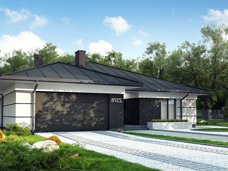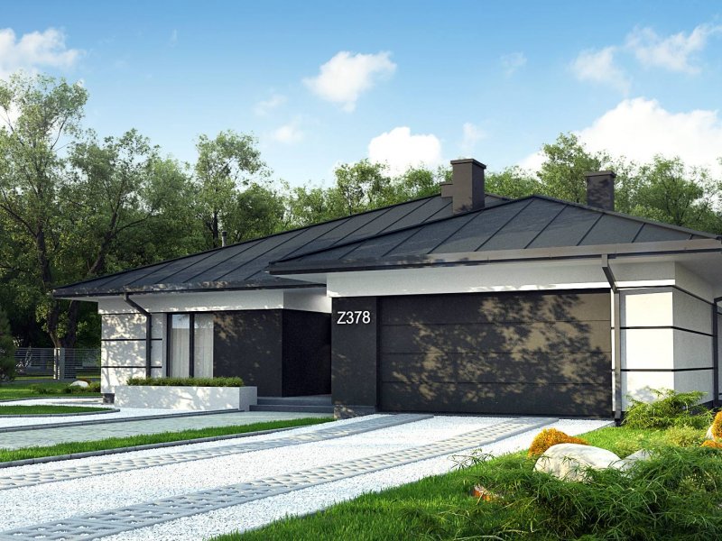 Z378 to propozycja współczesnego domu parterowego z dachem wielospadowym i garażem dwustanowiskowym. Wykończony białym tynkiem z dodatkiem boniowania, delikatnym gzymsem oraz czarnym betonem architektonicznym. Dodatkowo podcień wejściowy nadaje uroku całości bryły.