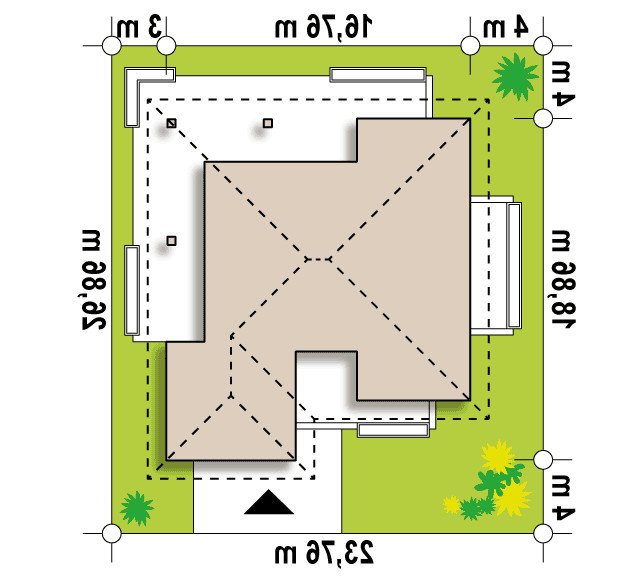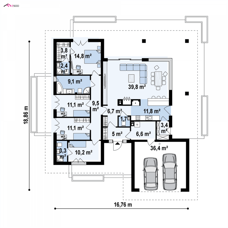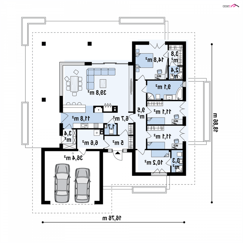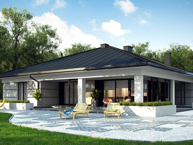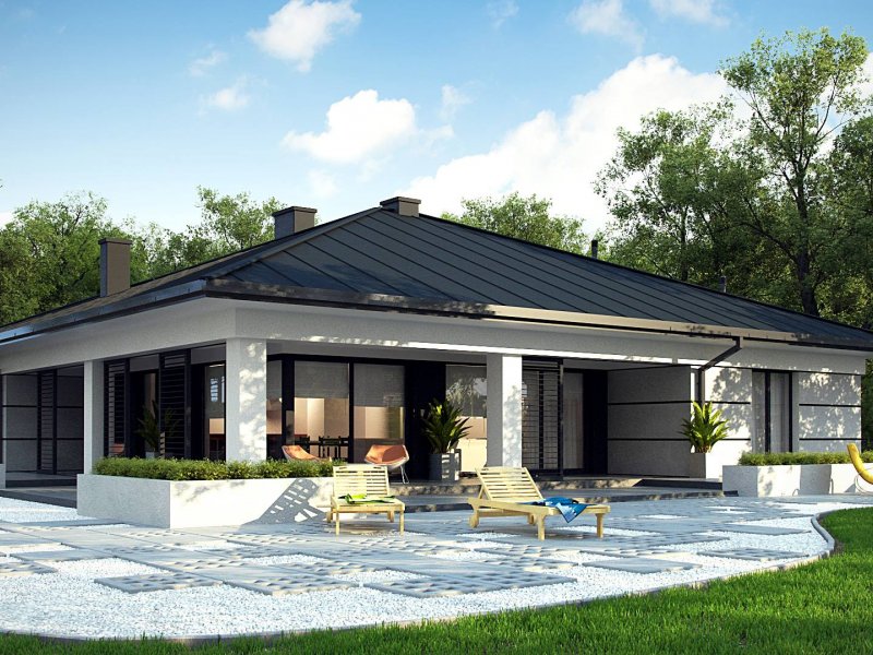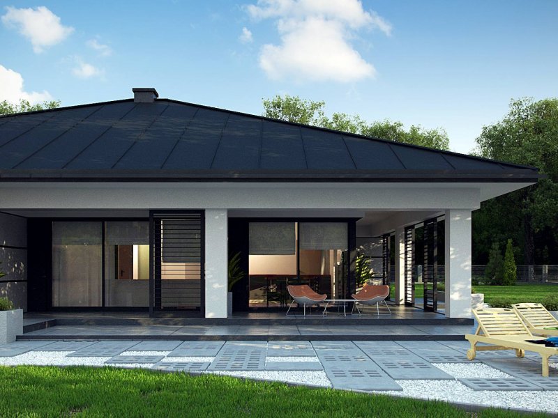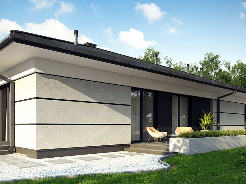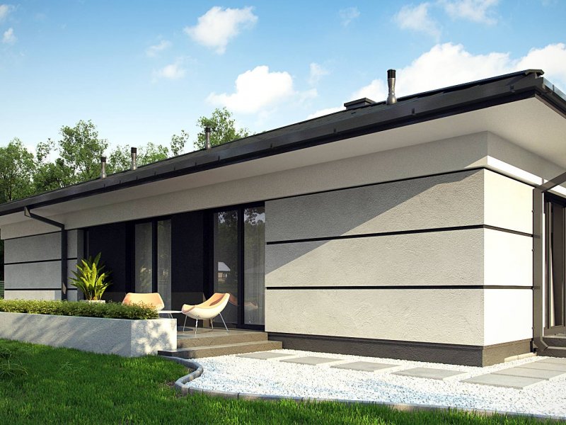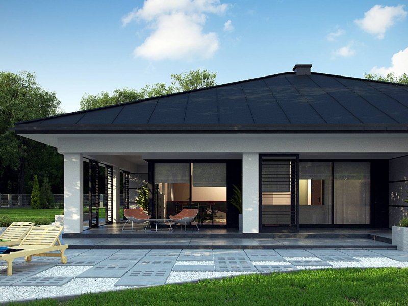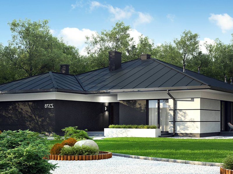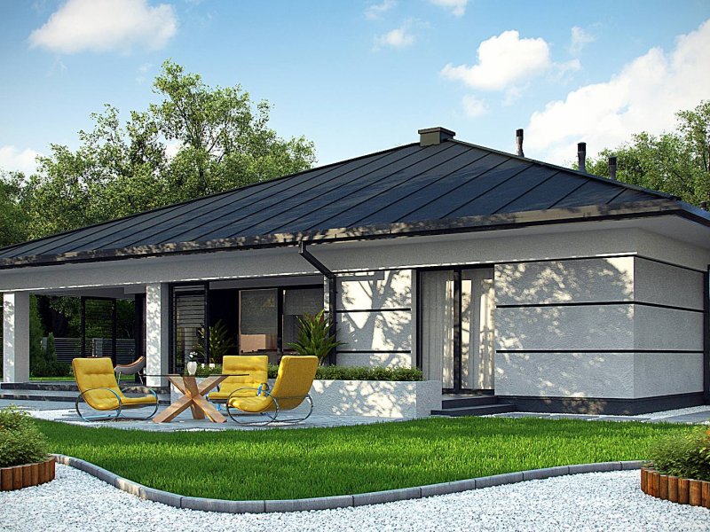 Z378 to propozycja współczesnego domu parterowego z dachem wielospadowym i garażem dwustanowiskowym. Wykończony białym tynkiem z dodatkiem boniowania, delikatnym gzymsem oraz czarnym betonem architektonicznym. Dodatkowo podcień wejściowy nadaje uroku całości bryły.