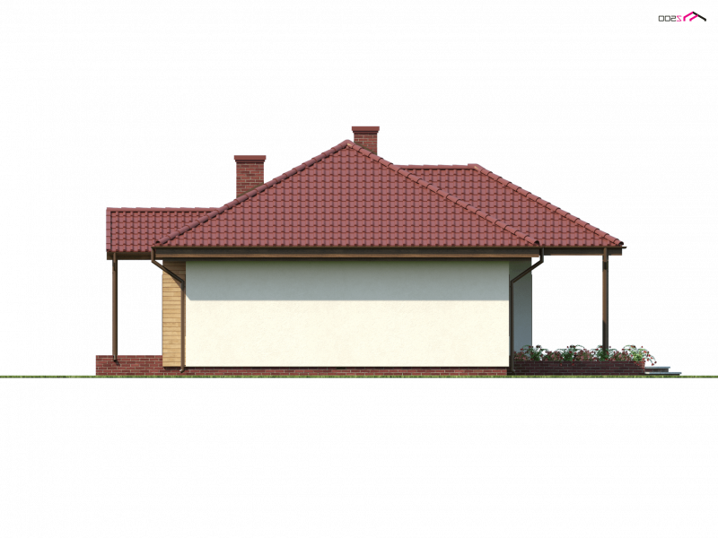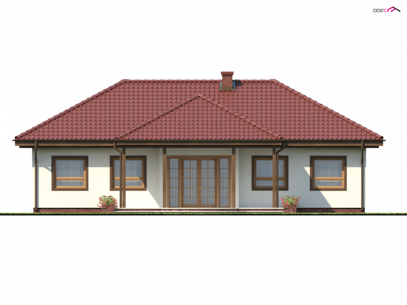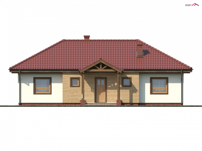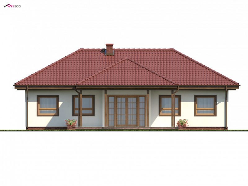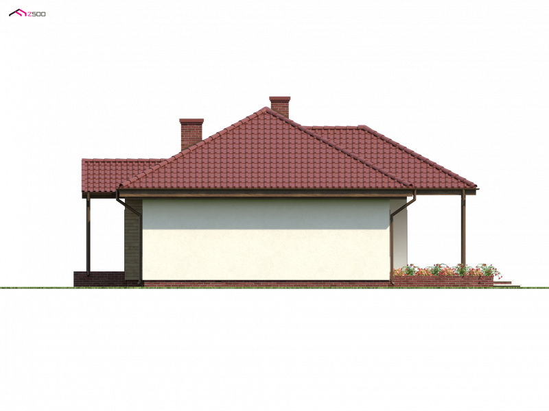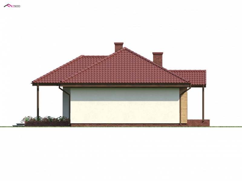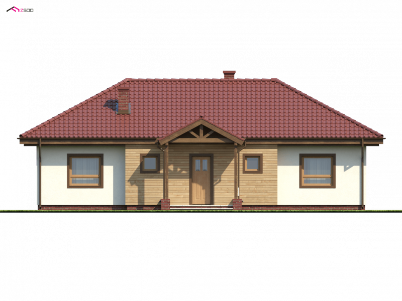 Z5 to projekt domu parterowego z kopertowym dachem o reprezentacyjnym charakterze. Wyróżniona strefa wejściowa z daszkiem podpartym dwoma słupami,symetryczny układ elewacji oraz wykusz w salonie podkreślają osiową formę budynku.