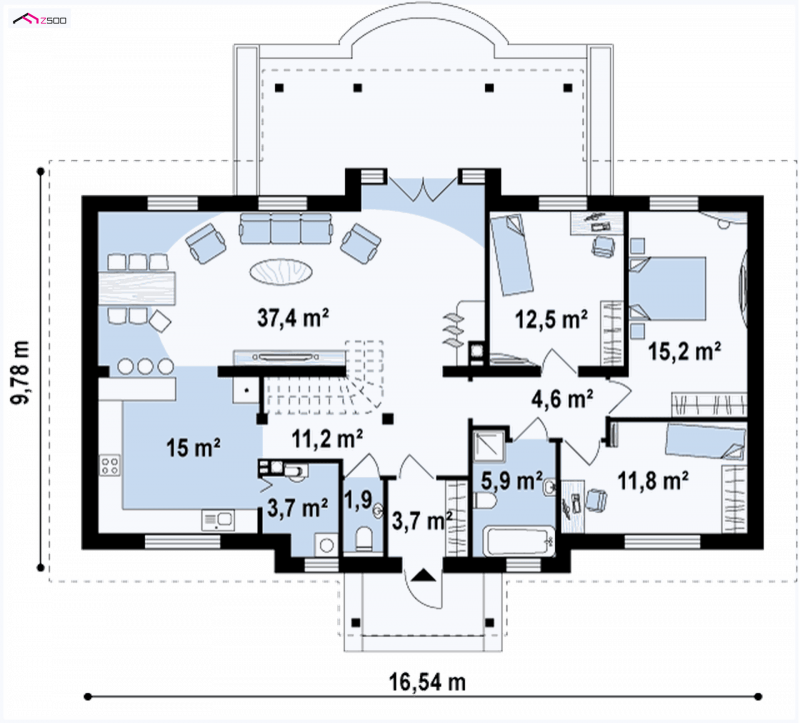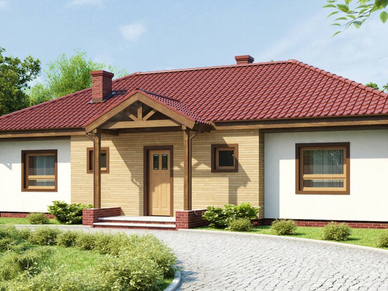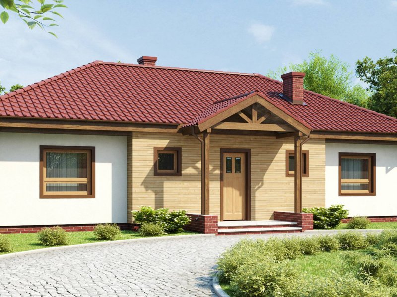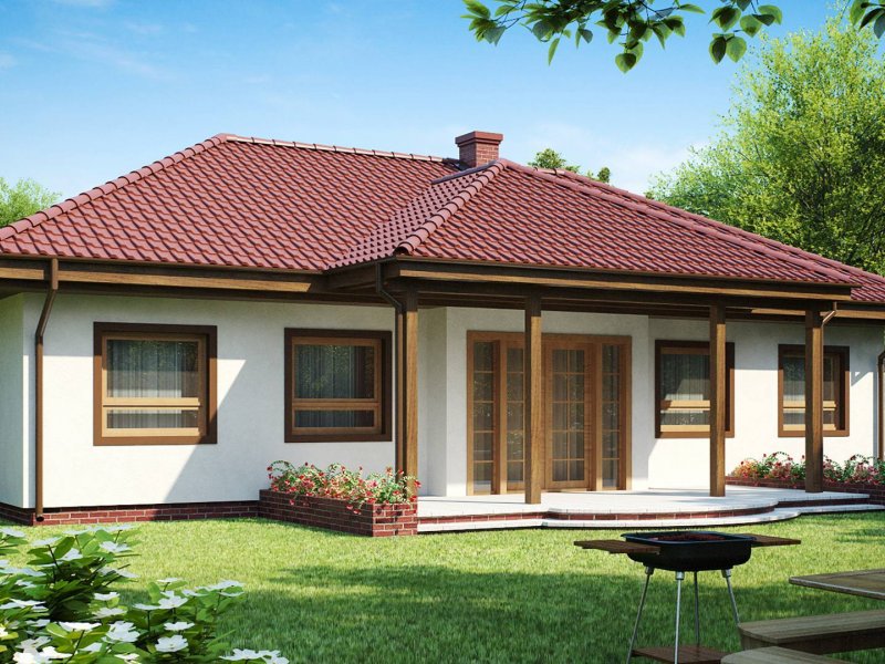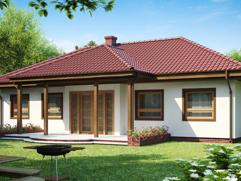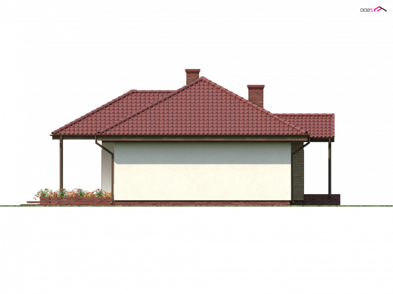 Z5 to projekt domu parterowego z kopertowym dachem o reprezentacyjnym charakterze. Wyróżniona strefa wejściowa z daszkiem podpartym dwoma słupami,symetryczny układ elewacji oraz wykusz w salonie podkreślają osiową formę budynku.