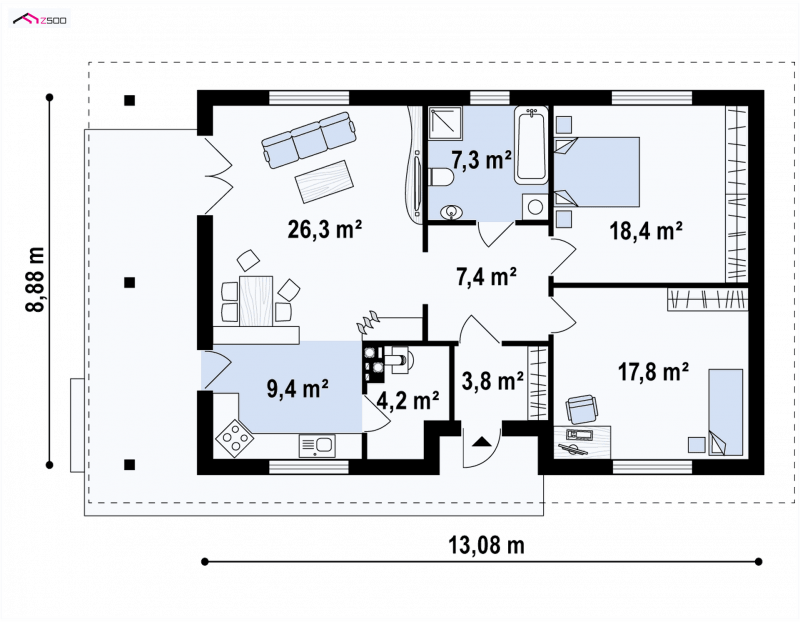 Z55 znajdzie swoich zwolenników wśród osób ceniących sobie zalety domu parterowego. W podstawowej wersji przewidzieliśmy możliwość wykorzystania strychu – jak dodatkowej przestrzeni dostępnej np. za pomocą schodów składanych.