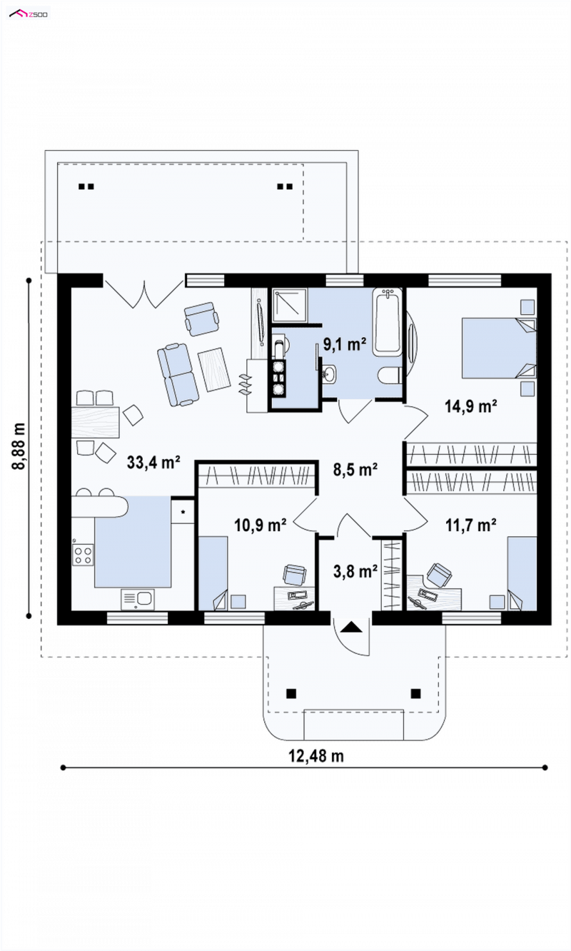 Z61 to projekt dla osób, które cenią sobie wygodę i komfort mieszkania. Dzięki prostej konstrukcji, dom jest tani i szybki w budowie. Niewielkie wymiary sprawiają, ze dom doskonale sprawdzi się także jako wygodny domek letniskowy.
