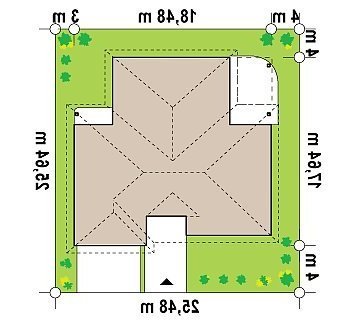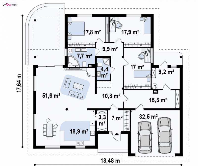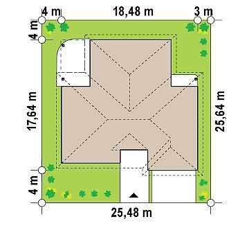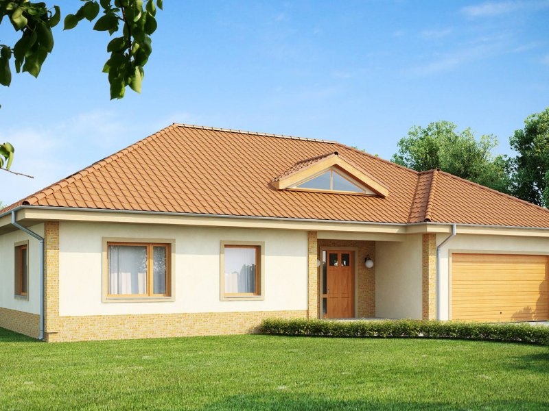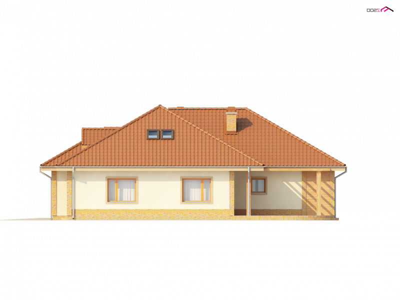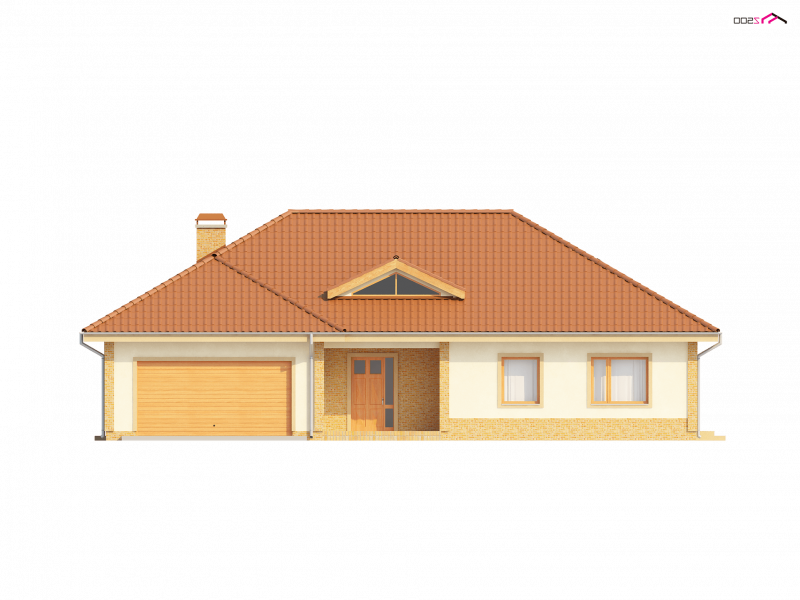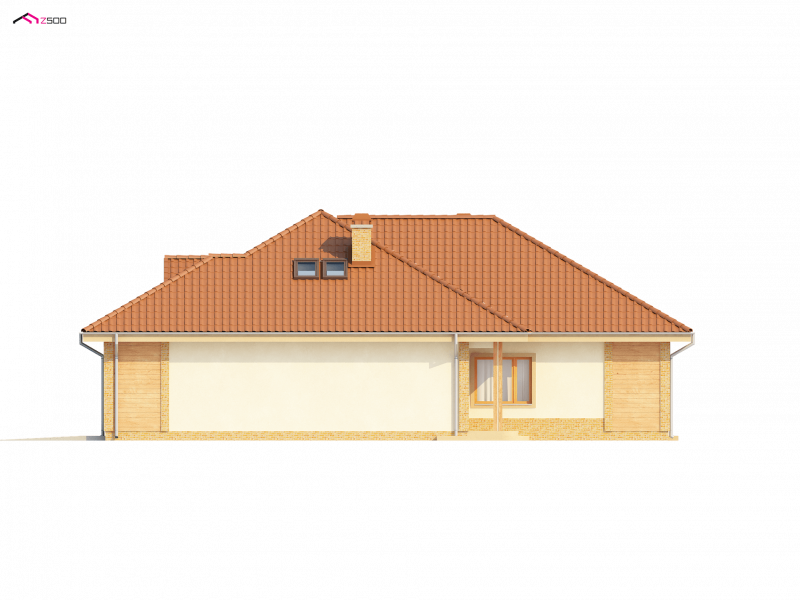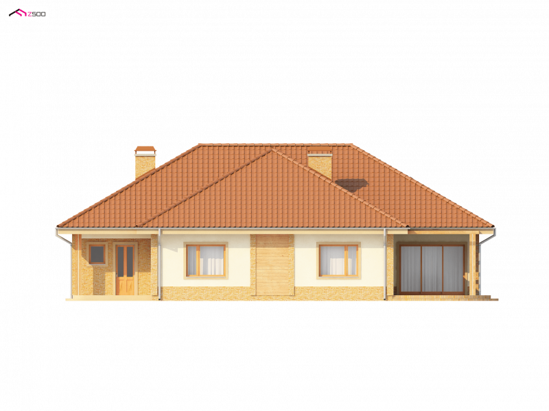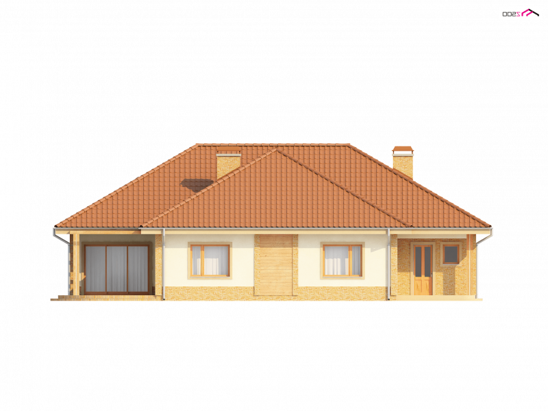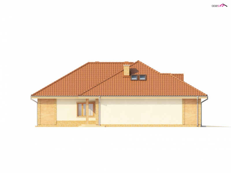 Zadaszone wejście zaprasza do optymalnej sieni z miejscem na szafę wnękową. Centralnie zlokalizowany hol jest węzłem komunikacyjnym domu. Prawe skrzydło domu to część reprezentacyjna, salon z otwartą kuchnią ma ponad 70m2. Kuchnia posiada podręczną spiżarkę choć jest w niej wystarczająco dużo miejsca na całą zabudowę i wiszące szafki. Jeśli spiżarka to za dużo, zawsze można zlikwidować ściankę działową i powiększyć znacząco sień. Poprzez pomieszczenie gospodarcze można dostać się bezpośrednio do garażu oraz do pomieszczenia technicznego z dostępem od zewnątrz. Na wprost holu znajduje się korytarz, który oddziela dyskretnie część dzienną od części sypialnej. Przy korytarzu zlokalizowano dwie łazienki i trzy duże pokoje z miejscami na długie szafy garderobiane.