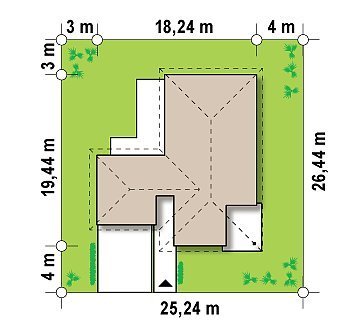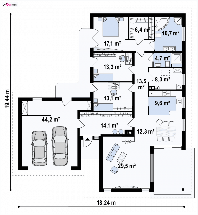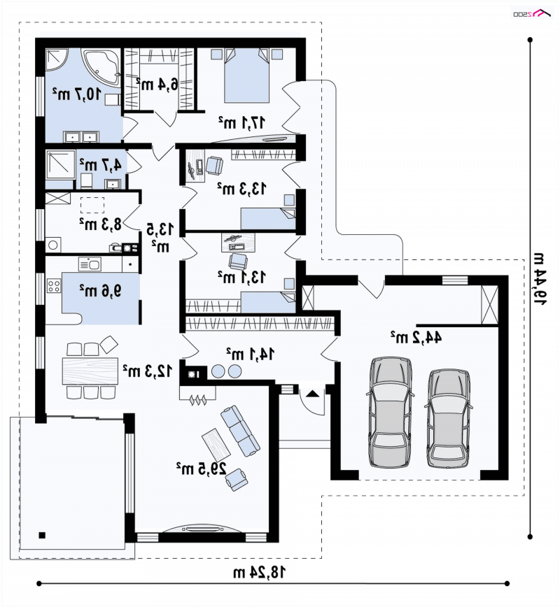 Przez zadaszone wejście wchodzimy do obszernej sieni, w której przewidziano miejsca na szafy. Z holu głównego dostępna jest strefa dzienna, w której poszczególne przestrzenie przenikają się wzajemnie. Salon połączony jest z jadalnią, a kuchnia może być wydzielona ścianą lub pozostać częściowo otwarta. Pokoje oraz strefę sypialną umieszczono w tylnym skrzydle budynku, dzięki czemu każdy pokój posiada wyjście na zewnętrzne patio. Największa z sypialni ma prywatną łazienkę oraz wydzieloną garderobę. W lewej części domu znajduje się dwustanowiskowy garaż z pomieszczeniem gospodarczym na jego tyłach.