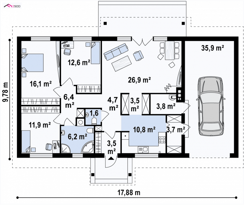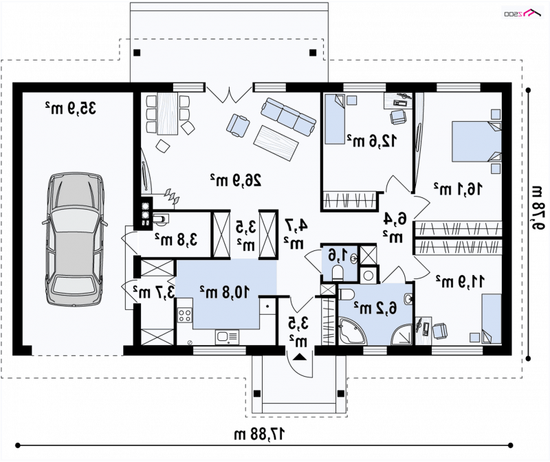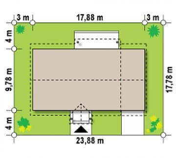 - Min. wymiary działki 17.78x23.88 m