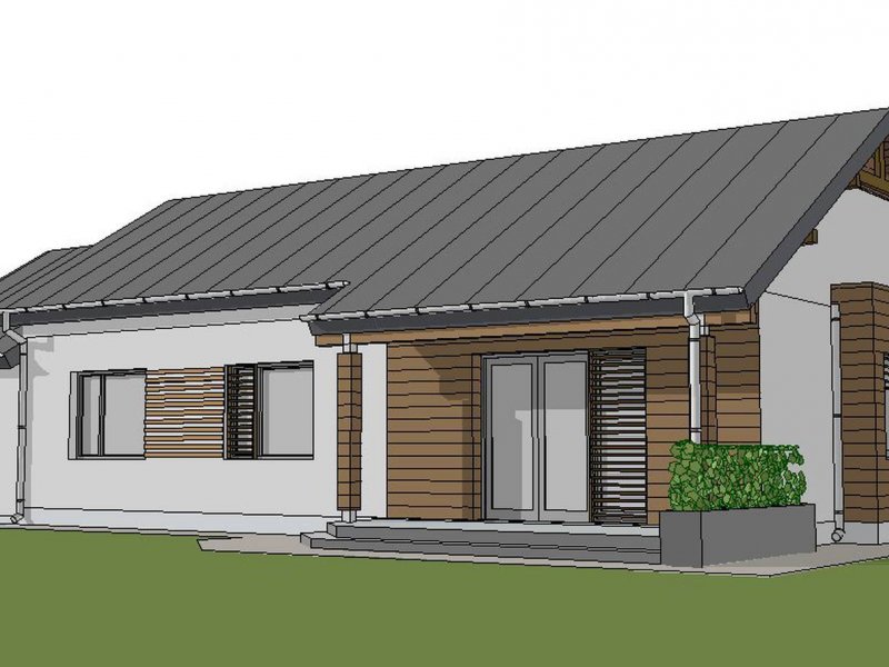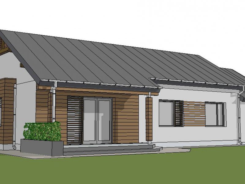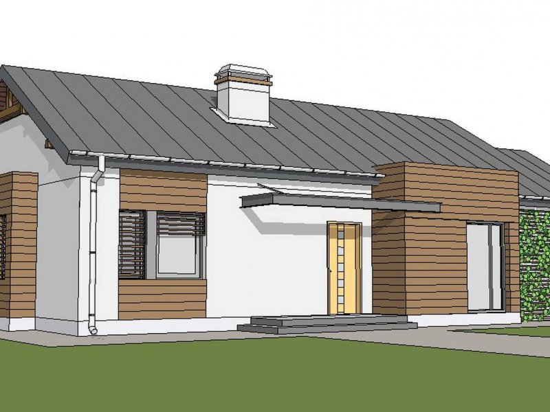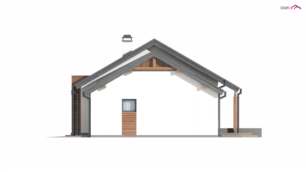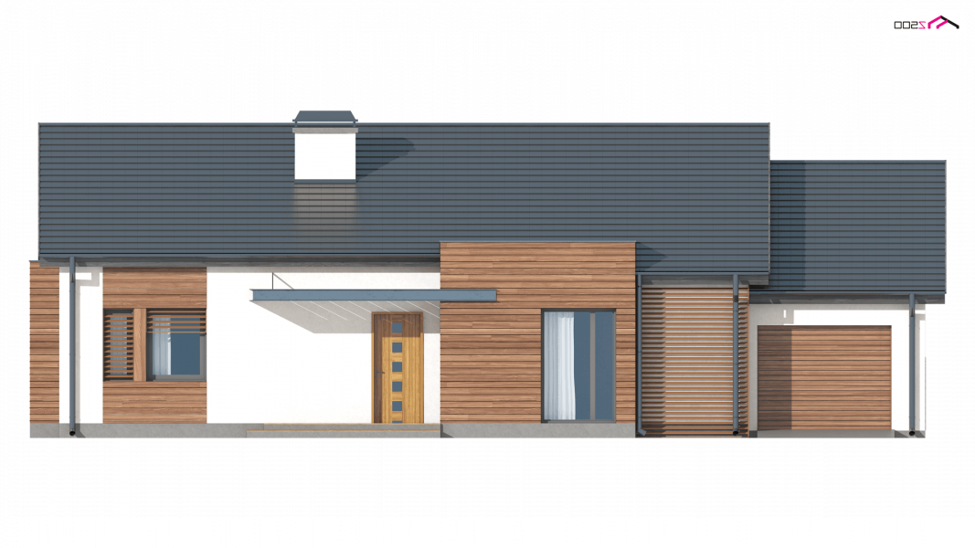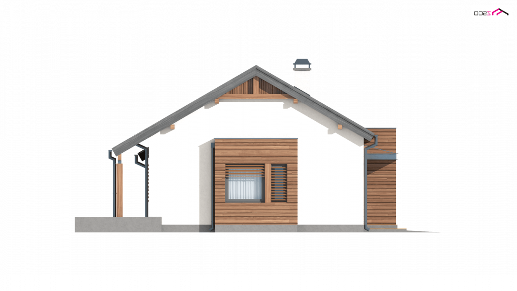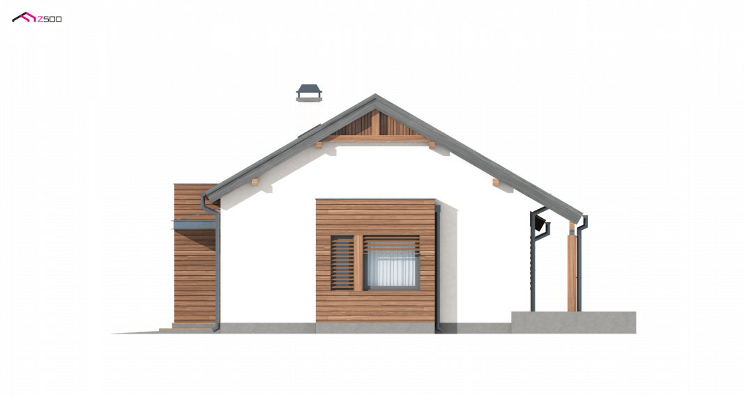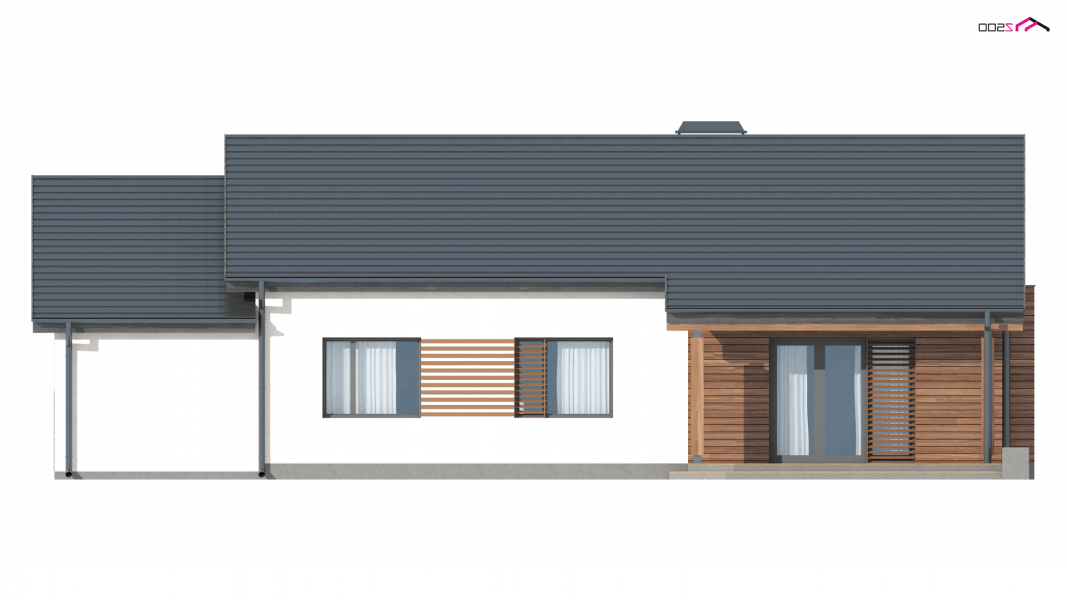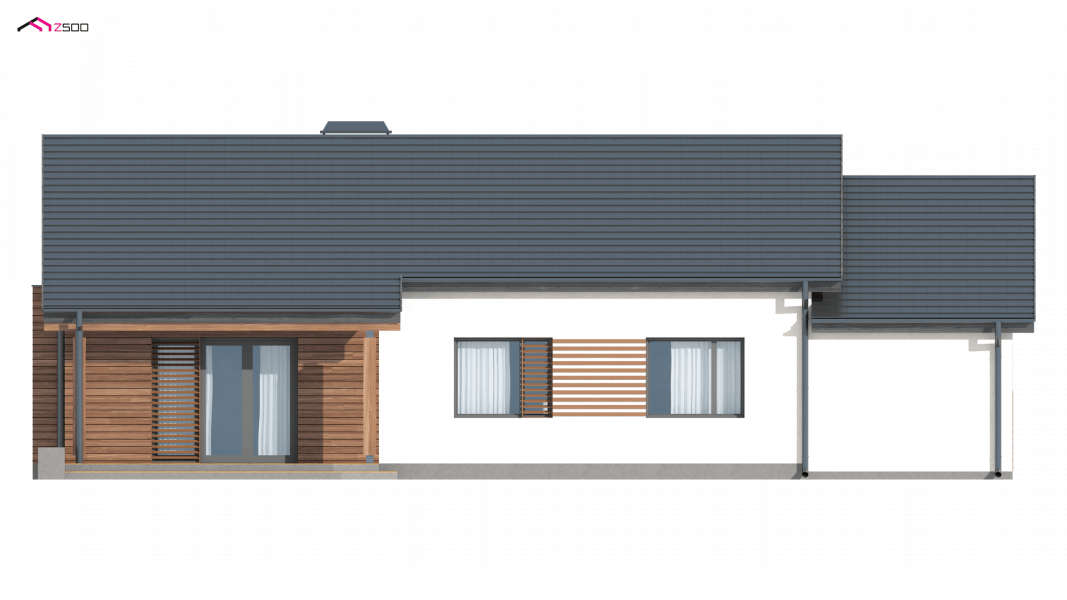 Z93 GL to zgrabny, funkcjonalny dom parterowy dla 4-osobowej rodziny. Prostą bryłę z dwuspadowym dachem urozmaicają dwa wykusze - jeden w kuchni, drugi w głównej sypialni. Okładziny z ciemnego drewna na elewacjach, szara stolarka oraz ciekawe detale architektoniczne nadają nowoczesny wygląd. Nad wejściem zaprojektowano ażurową formę w lekkiej stalowej konstrukcji.