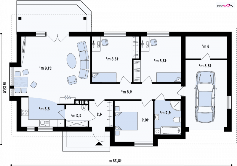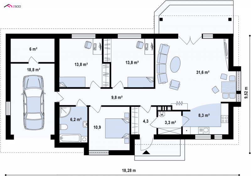 Z93 GL to dom parterowy z garażem jednostanowiskowym.