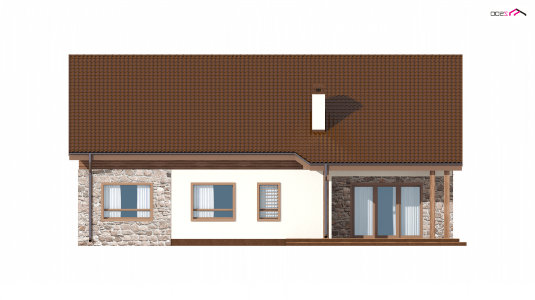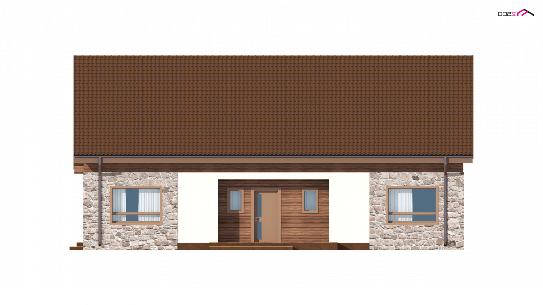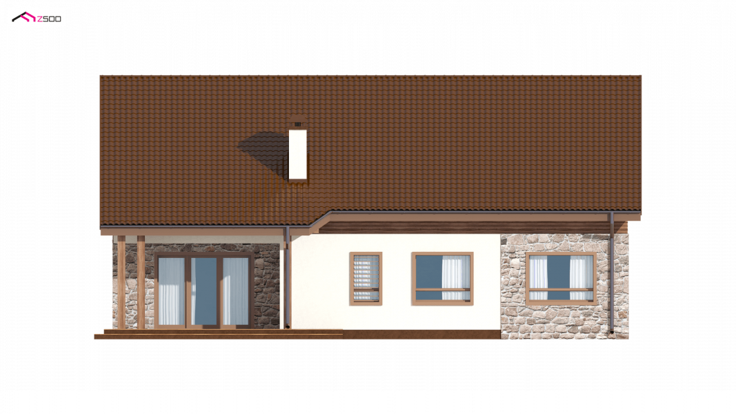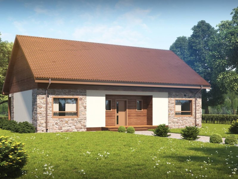 Projekt Z98 h+ prezentuje dom parterowy. Okładzina kamienna i drewniana nadaje ciepłego i naturalnego klimatu i charakteru temu budynkowi.