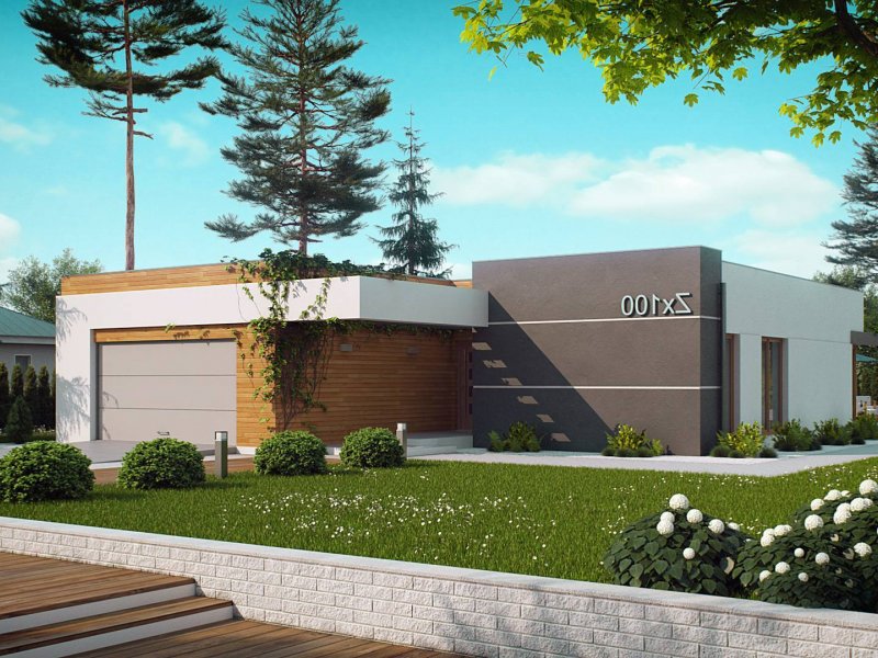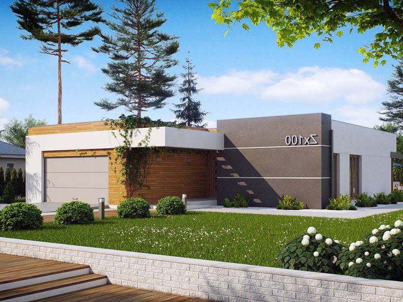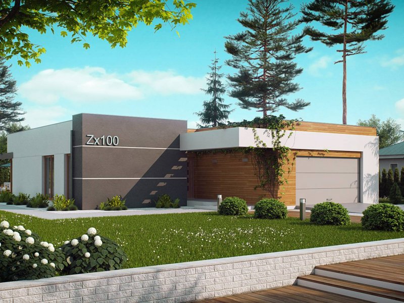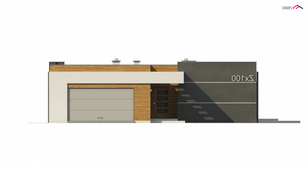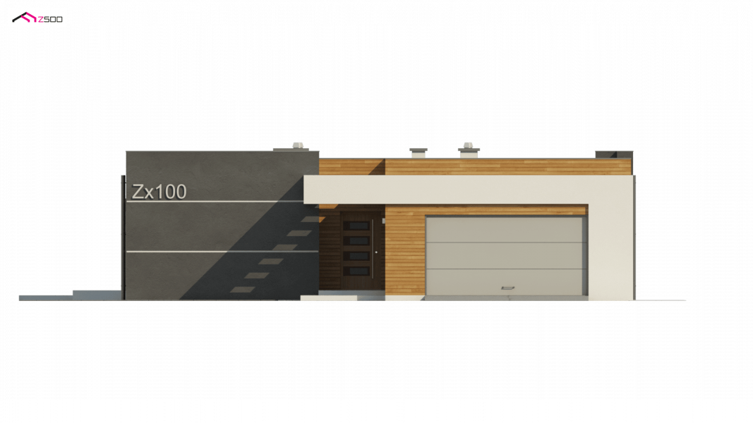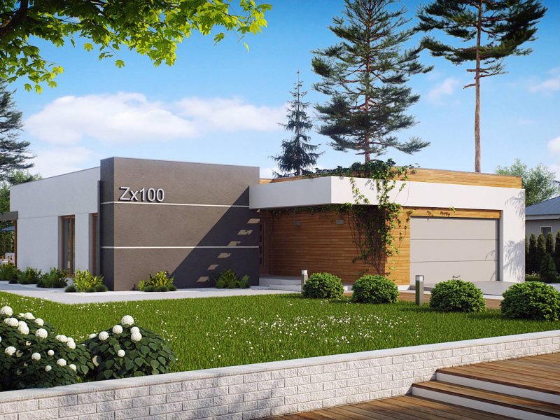 Zx100 to nowoczesny parterowy dom z dwustanowiskowym garażem w modernistycznym stylu.
