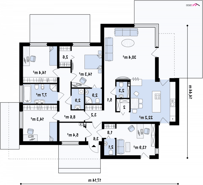 Projekt wyróżnia ciekawy układ funkcjonalny. Centrum domu to obszerna kuchnia w nowoczesnym stylu z wyspą oraz jadalnią. Kominek na granicy jadalni i salonu subtelnie wydziela granice i uprzyjemni wspólne posiłki przy dużym stole. Taki układ tworzy przestronną strefę dzienną z wyjściem na zadaszony taras. Strefa nocna to trzy identycznej wielkości sypialnie, każda z wyjściem na taras oraz bogate zaplecze gospodarcze w prawej części budynku. Zaprojektowano tu dużą łazienkę z oknem, pralnię oraz garderobę i mniejszą łazienkę przy pokoju gospodarzy. Racjonalny układ ścian konstrukcyjnych pozwala niemal dowolnie dopasować wielkość pokoi poprzez przesunięcie ścianek działowych. Ciekawym rozwiązaniem jest dodatkowy duży pokój od frontu. Może pełnić rolę wygodnego gabinetu z osobnym wc, pokoju gościnnego lub dodatkowej sypialni.
