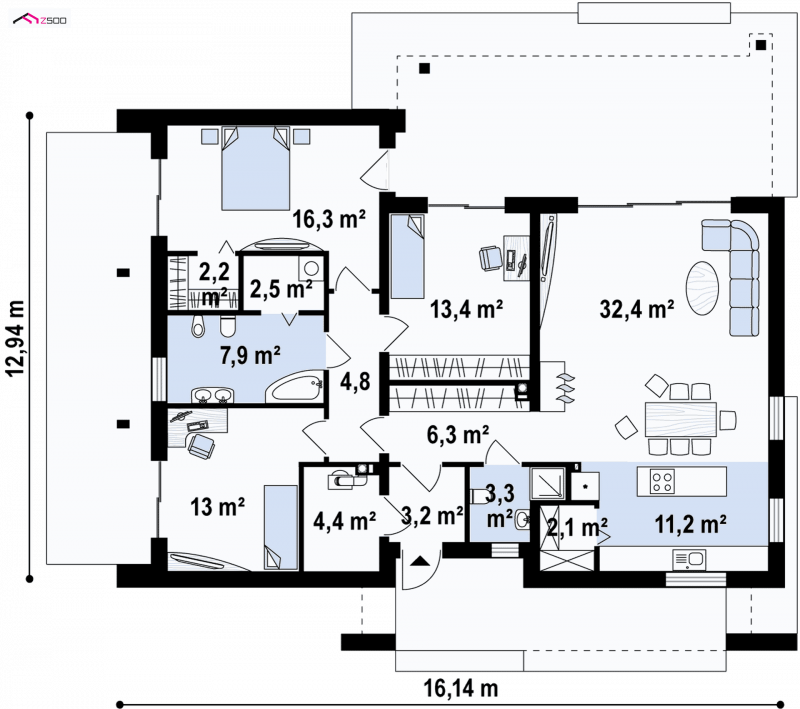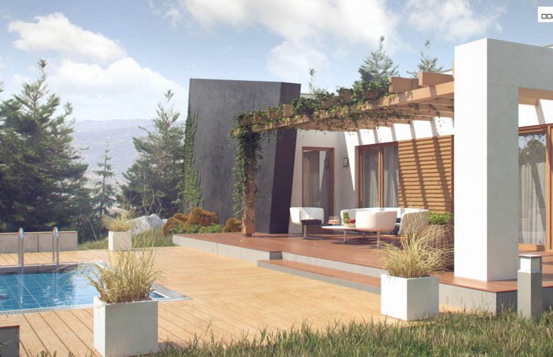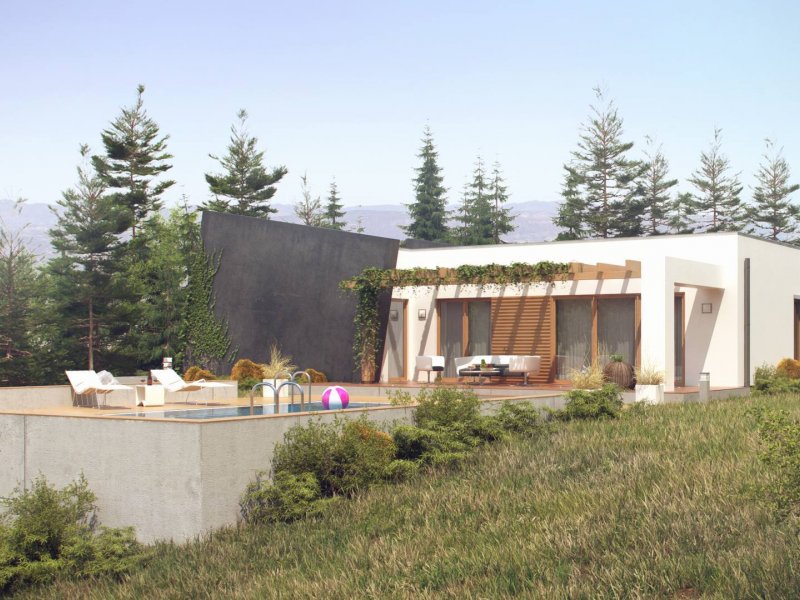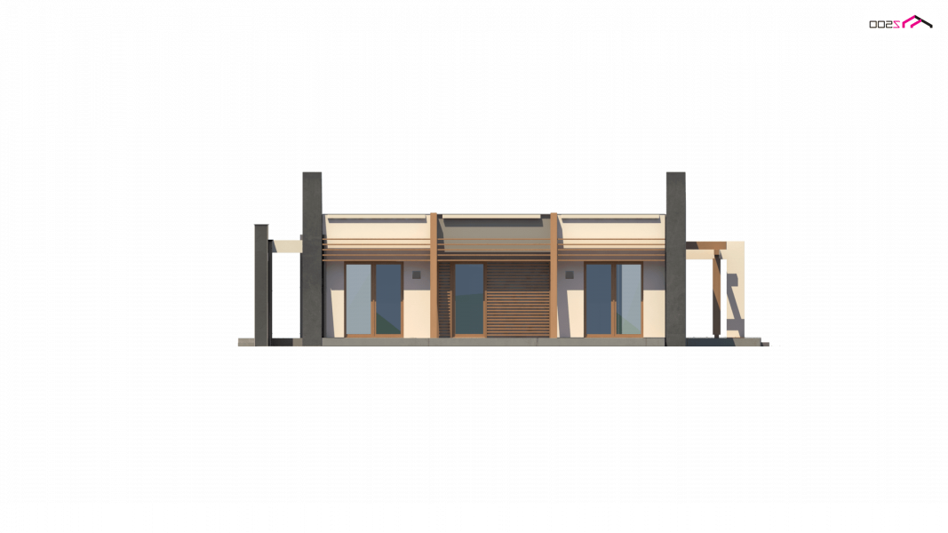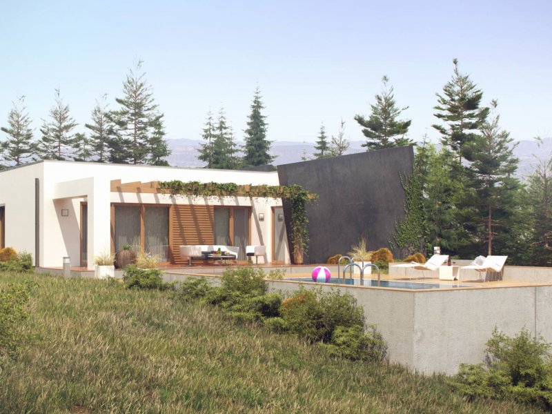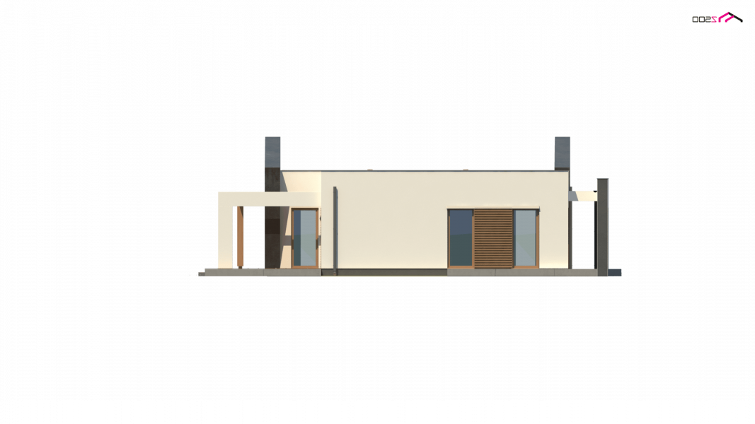 Dom oferuje na zaledwie 122 m² powierzchni użytkowej niezwykle funkcjonalną przestrzeń. Wnętrze domu wyraźnie podzielono na strefę dzienną i nocną. Część reprezentacyjna to przestronny, dobrze doświetlony salon z wyjściem na zadaszony taras. Otwarta kuchnia pozwala na nowoczesną aranżację z wyspą pośrodku. Przy kuchni znajduje się podręczna spiżarnia, a także mniejsza łazienka z natryskiem i miejsce na pojemne szafy w holu. W prywatnej części domowników zaprojektowano trzy komfortowe sypialnie. Każda posiada wyjście na taras. Do największego pokoju przynależygarderoba. W dużej łazience wydzielono dodatkowo pomieszczenie na pralnię.