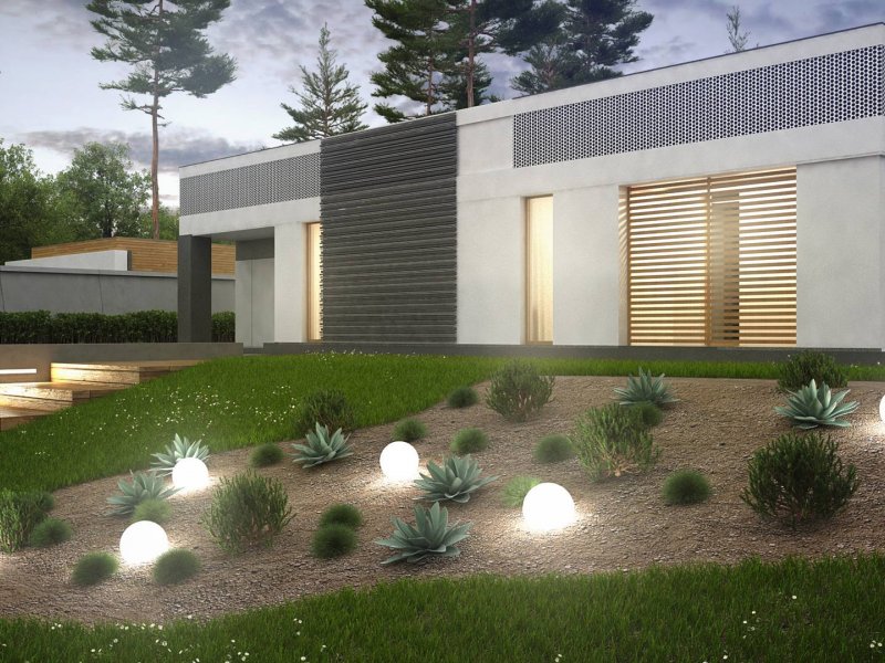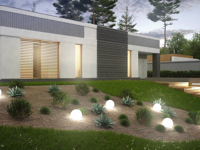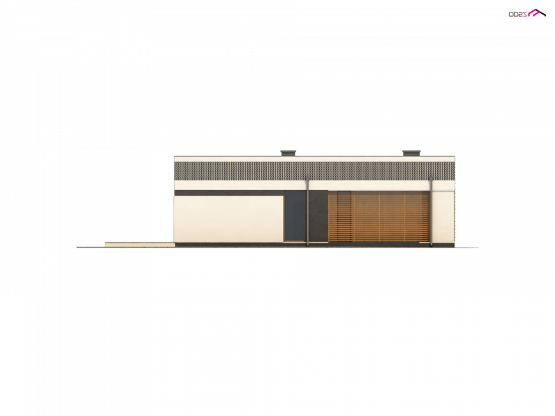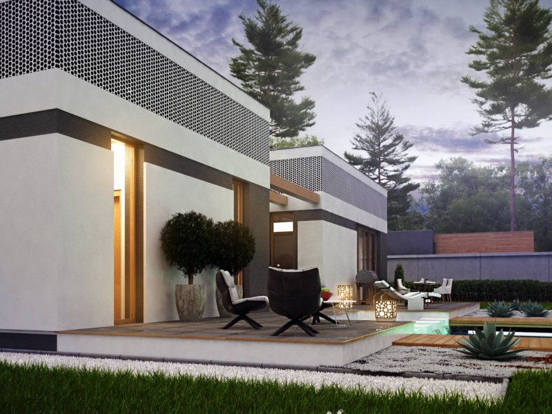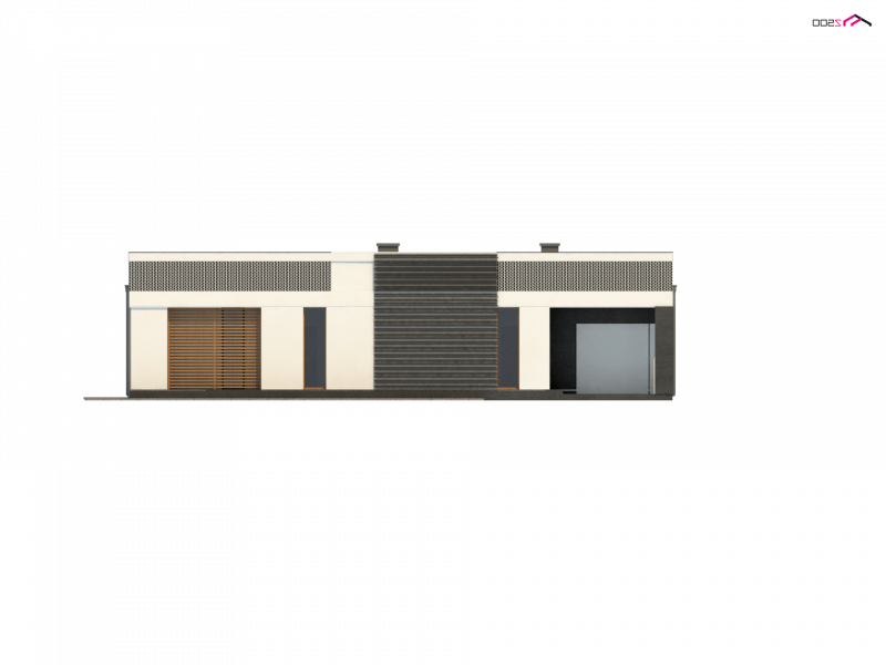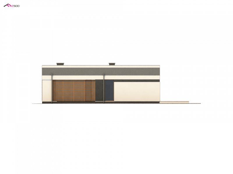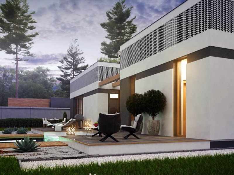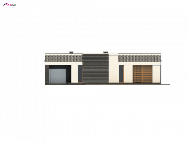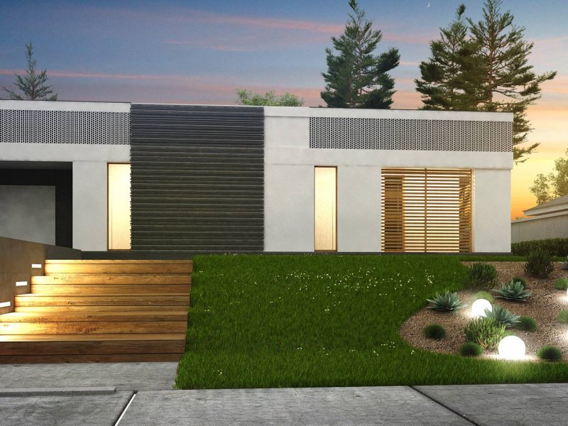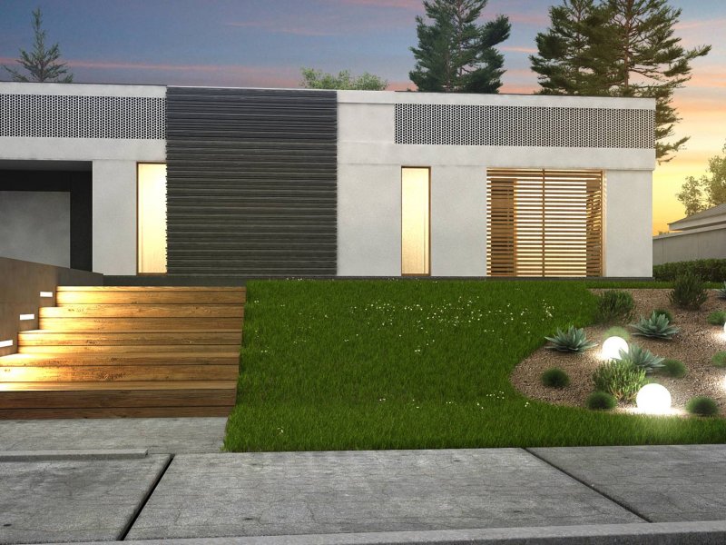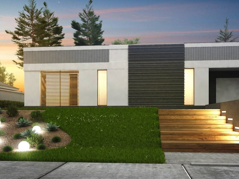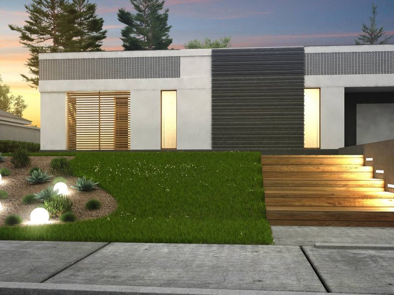To nowoczesny dom parterowy z płaskim dachem i garażem jednostanowiskowym.