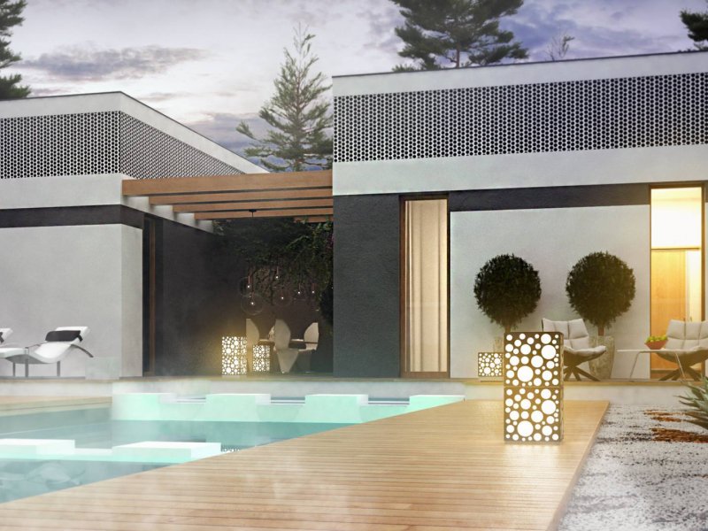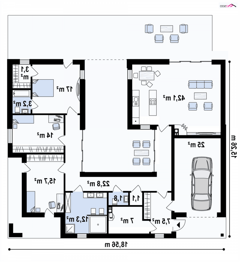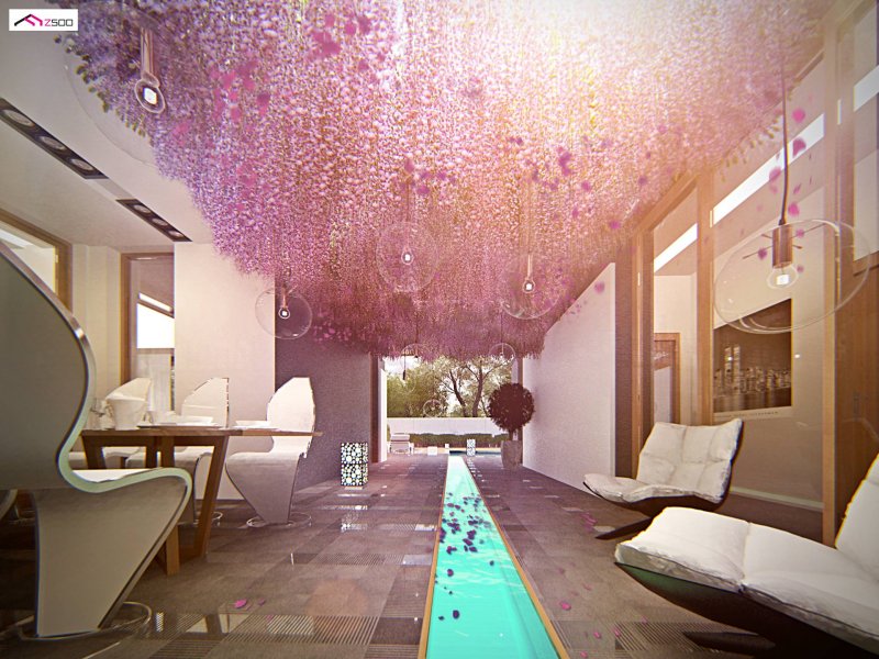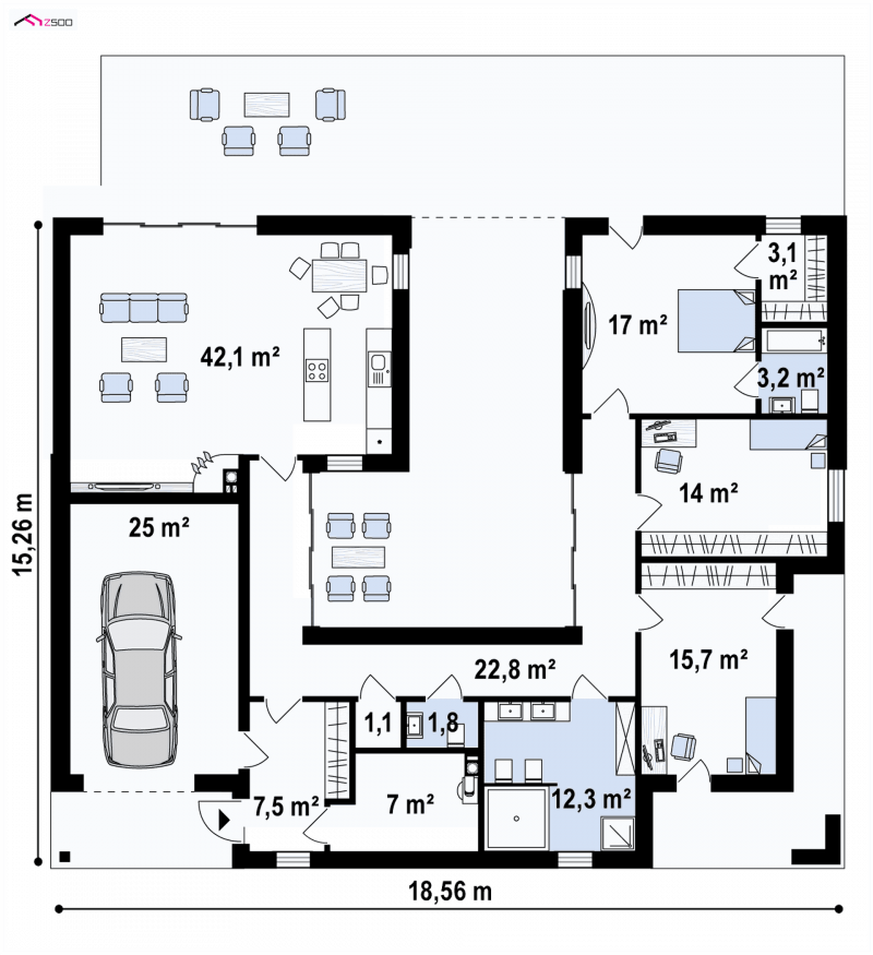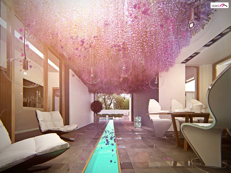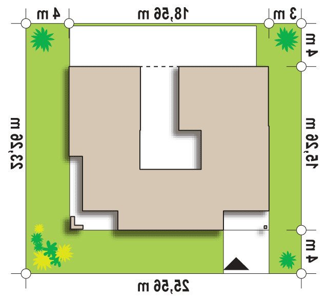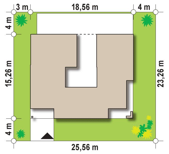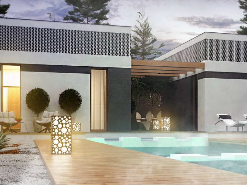 Wszystkie pomieszczenia w domu są zorganizowane wokół wewnętrznego atrium-ogrodu zimowego, który stanowi centralną część układu funkcjonalnego.