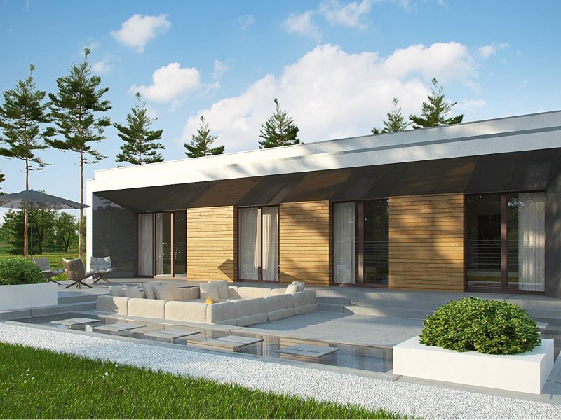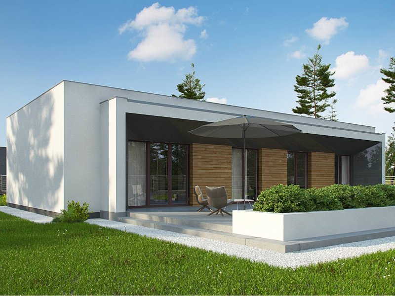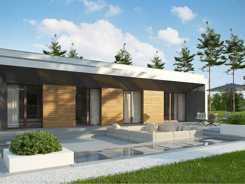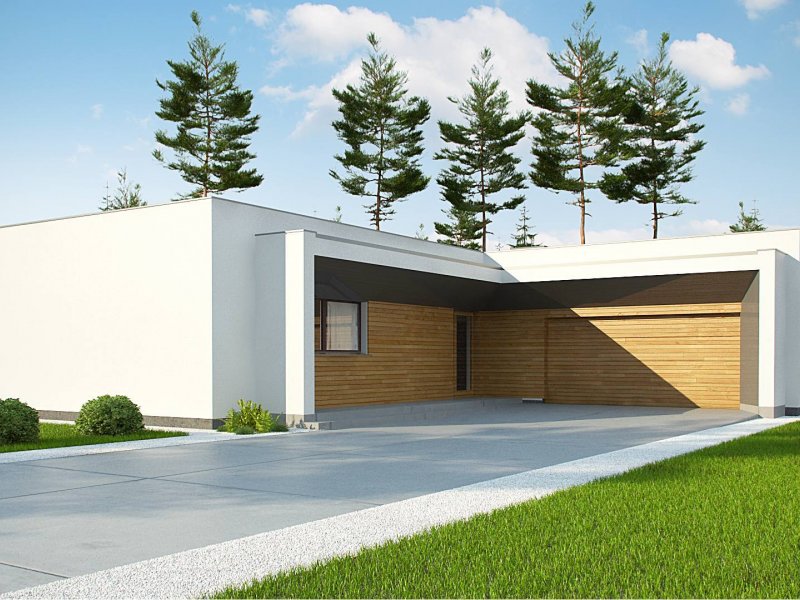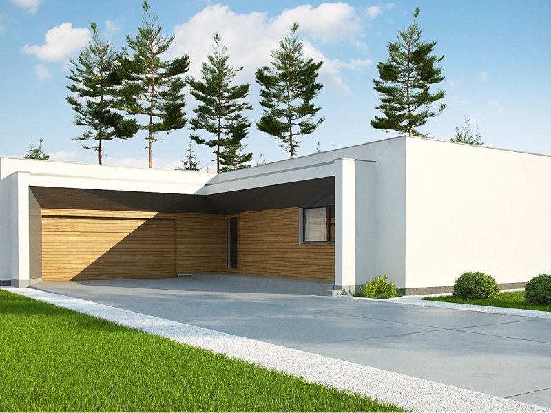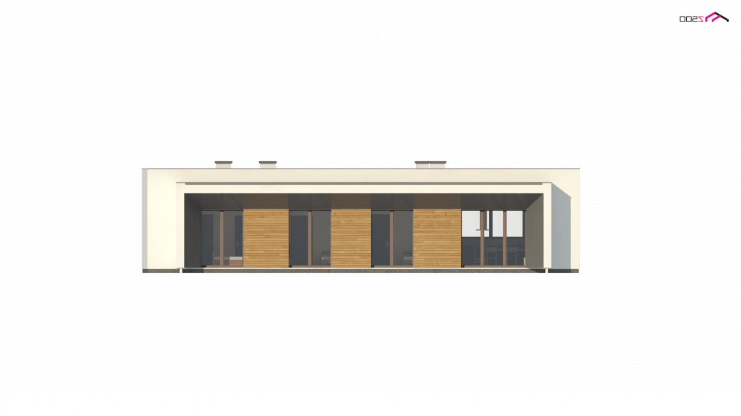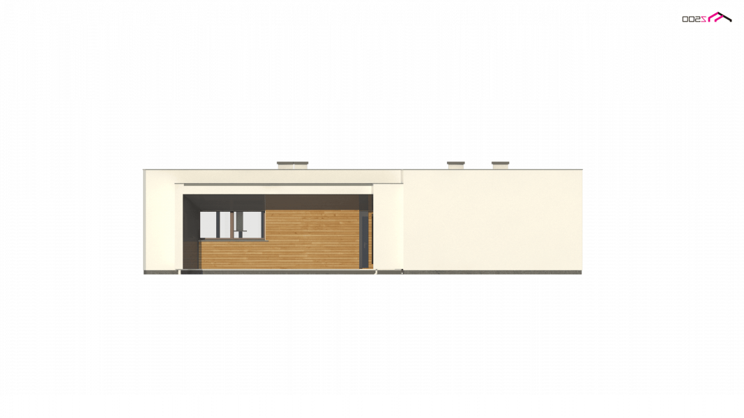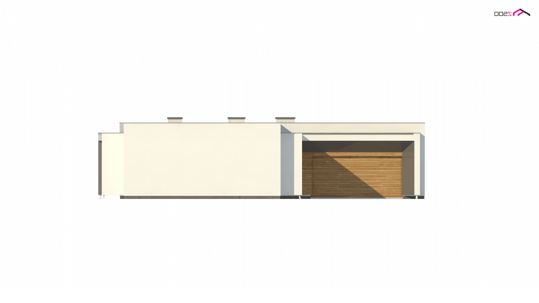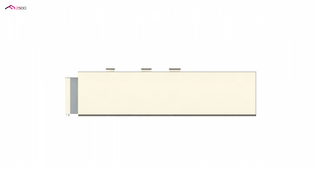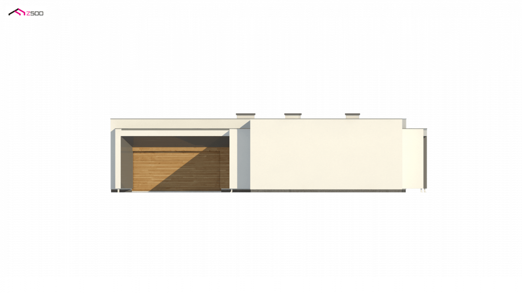 Zx135 to nowoczesny, parterowy dom zaprojektowany na planie litery „L” z garażem dwustanowiskowym do którego bramę można w razie potrzeby umieścić na elewacji frontowej oraz płaskim dachem. Jego biała elewacja w połączeniu z dużymi przeszkleniami w postaci okien portfenetrowych, nadają mu wrażenia elegancji, czystości i schludności. Charakterystyczne podcienie podkreślają strefę wejścia i strefę wypoczynkową położoną od strony ogrodowej.